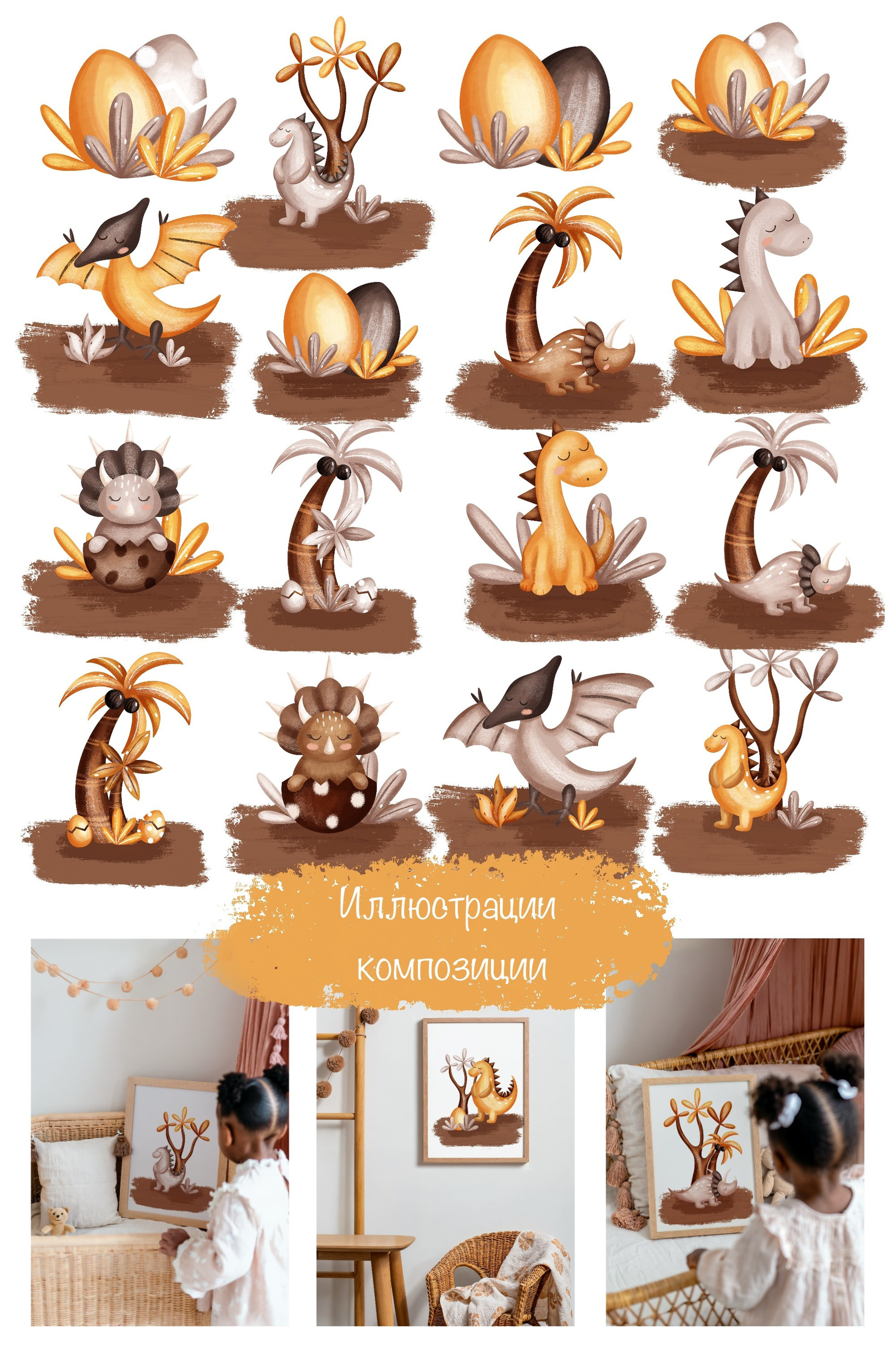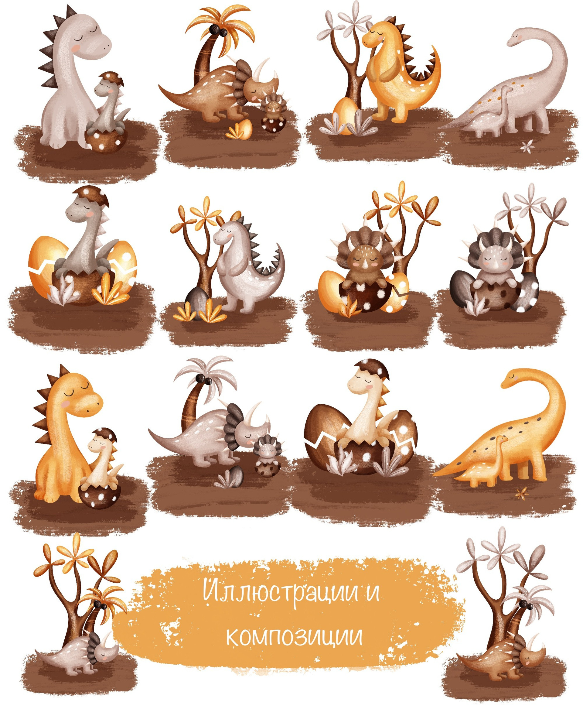 Коллекция «Милые динозавры» — графические иллюстрации, композиции, постеры и бесшовные паттерны