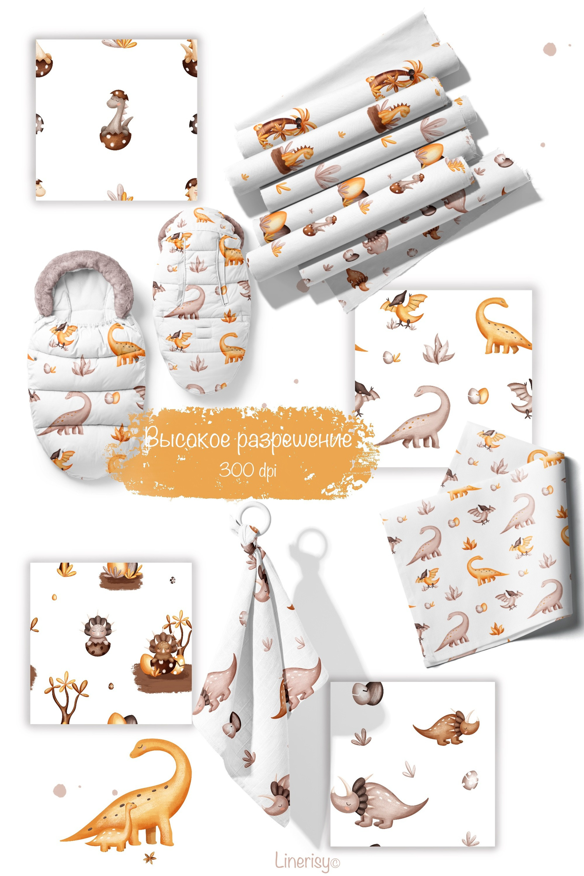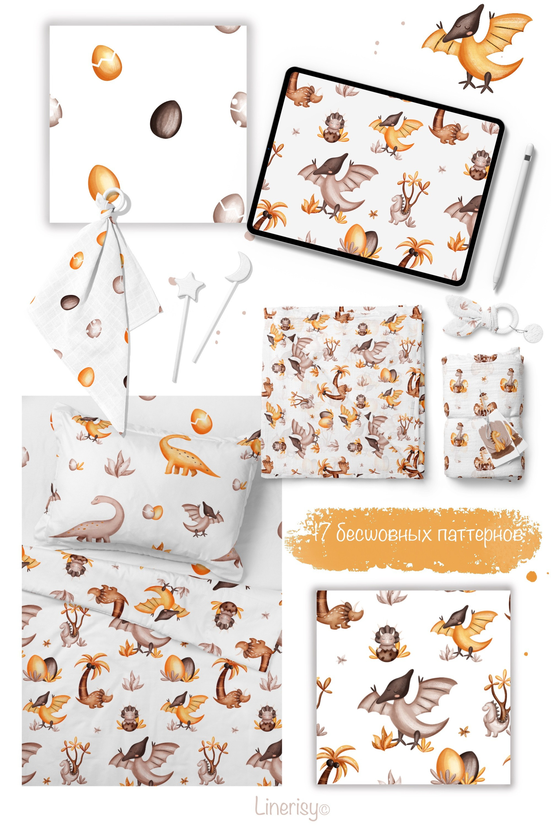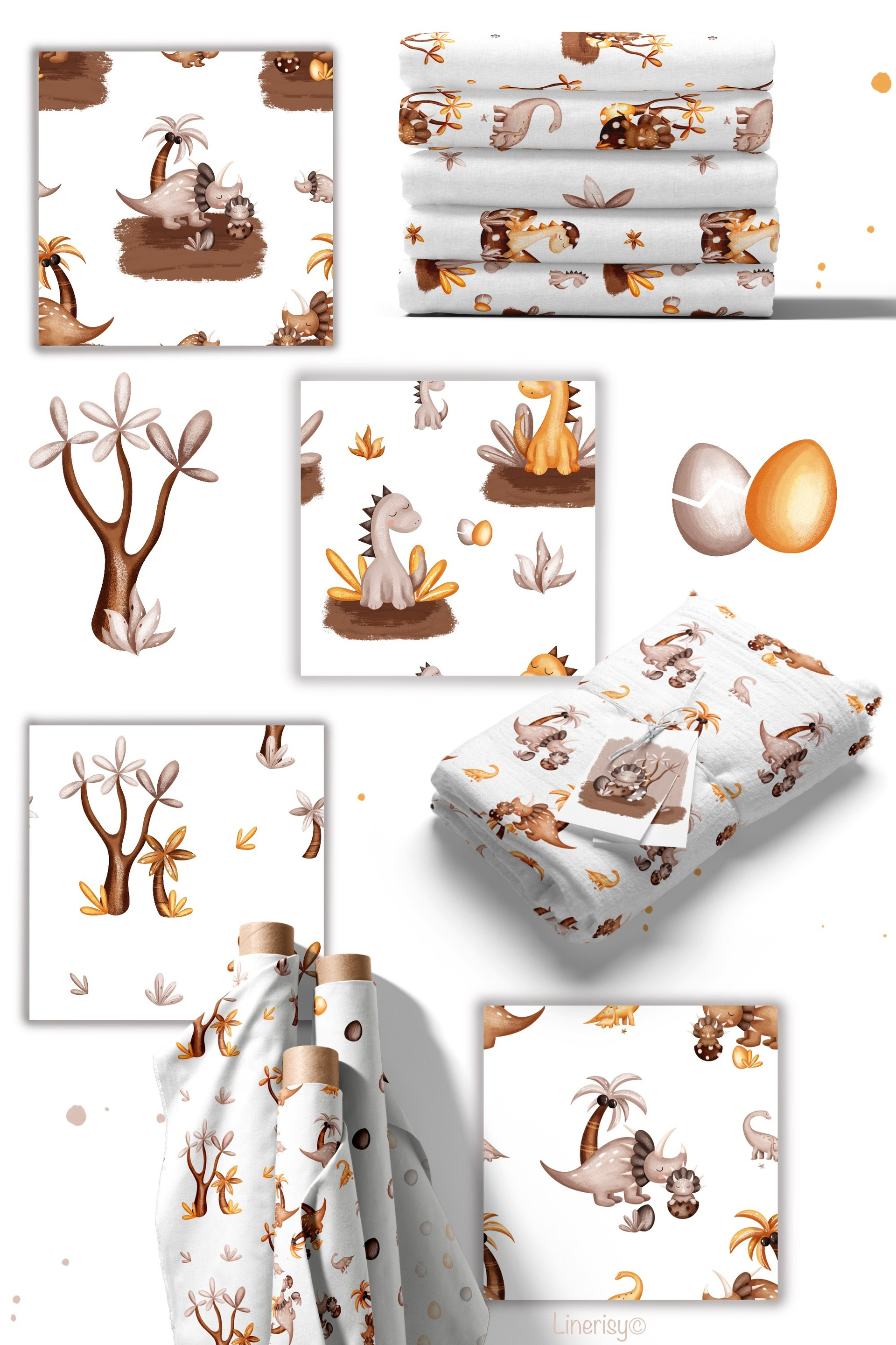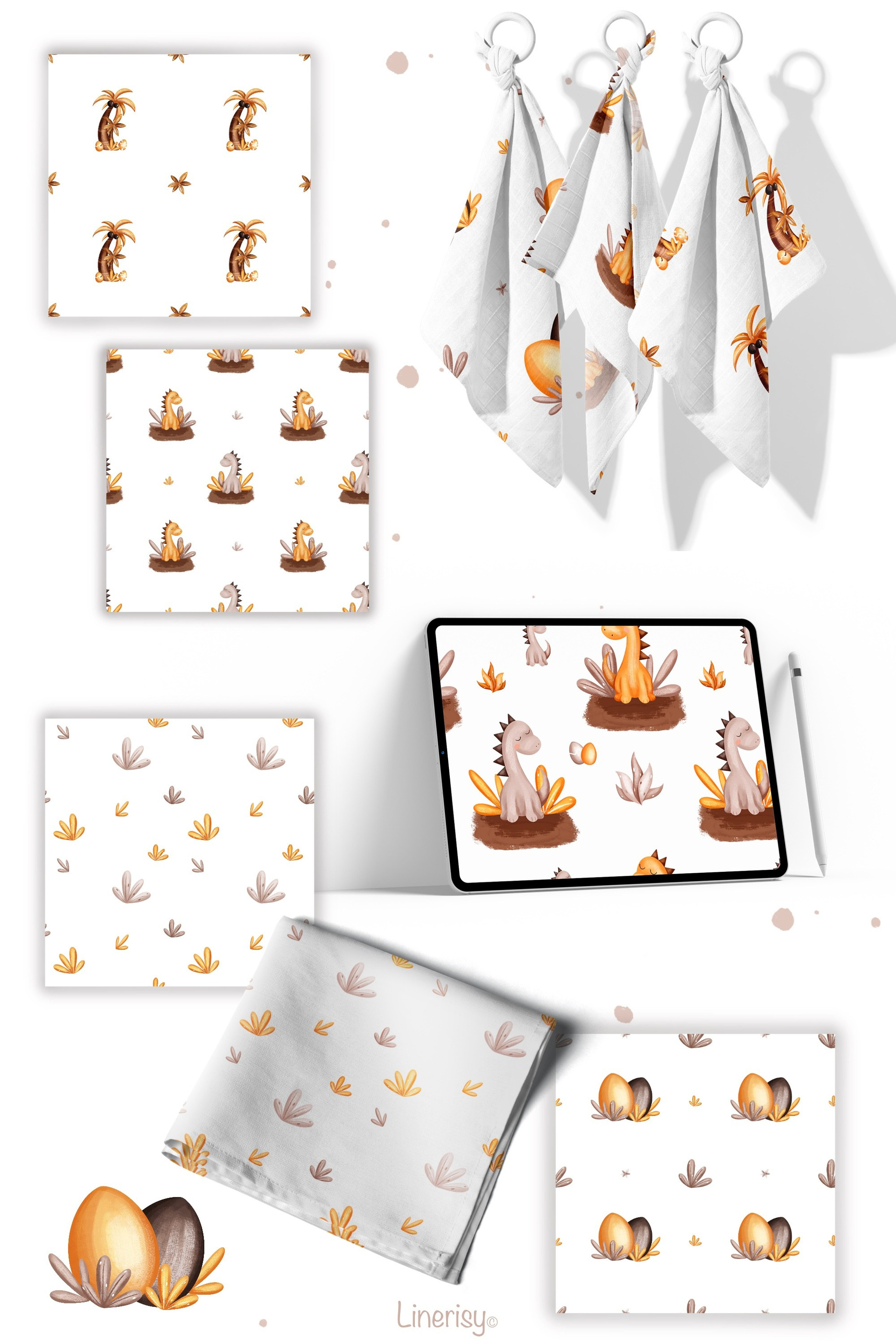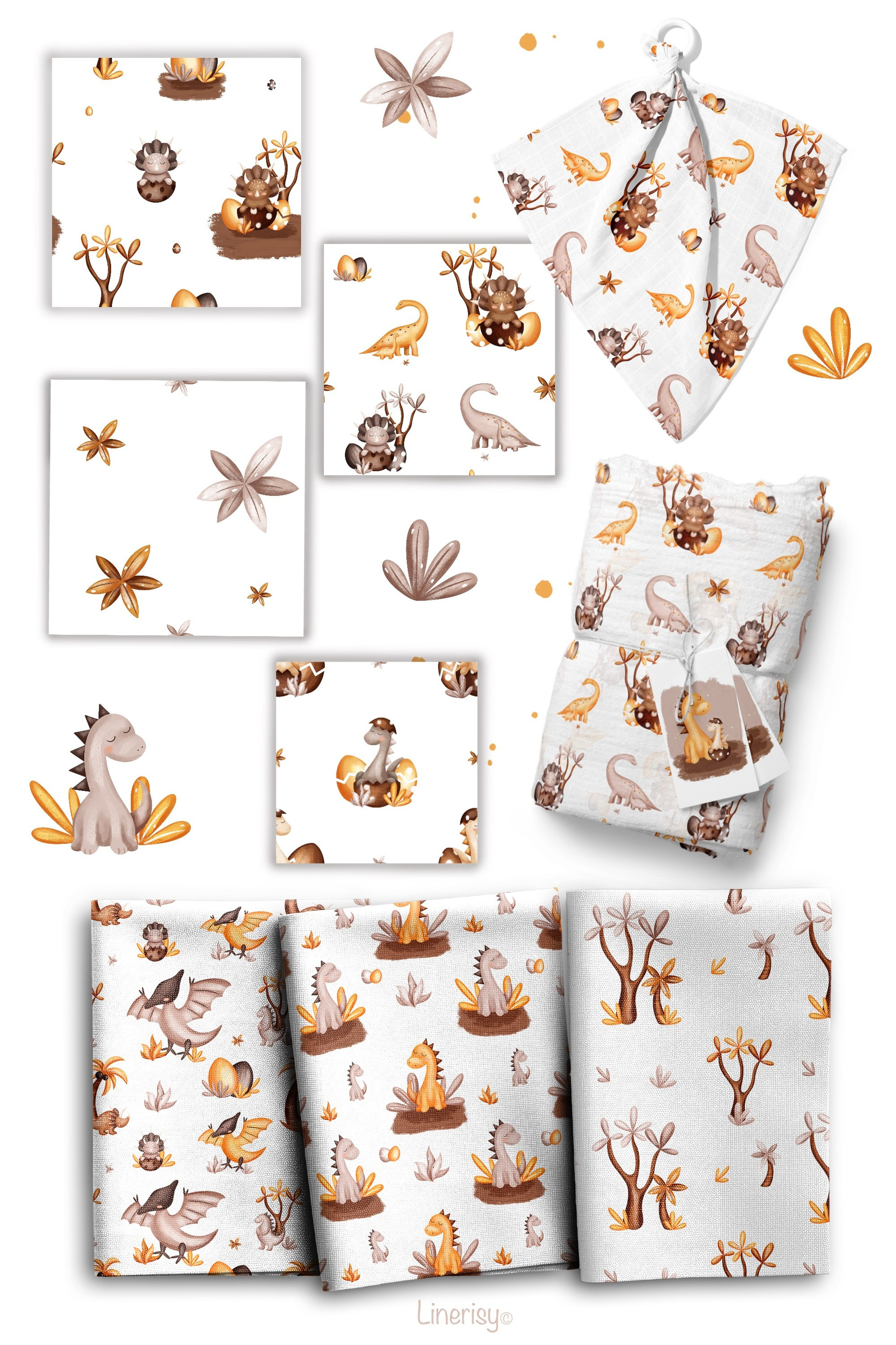 Яркая детская коллекция бесшовных паттернов, графических элементов, постеров и иллюстраций. В коллекции много разнообразных динозавров, детенышей динозавров, разных тропических растений и пальм. Иллюстрации нарисованы в ручную текстурными кистями в пастельной гамме. Коллекция идеально подходит для детских дизайнов, текстиля, одежды и других детских товаров
