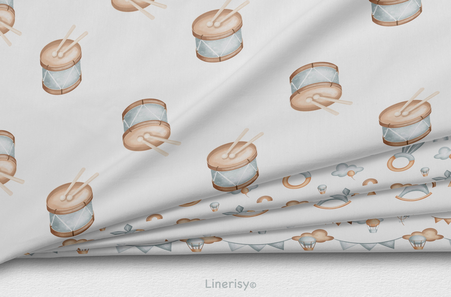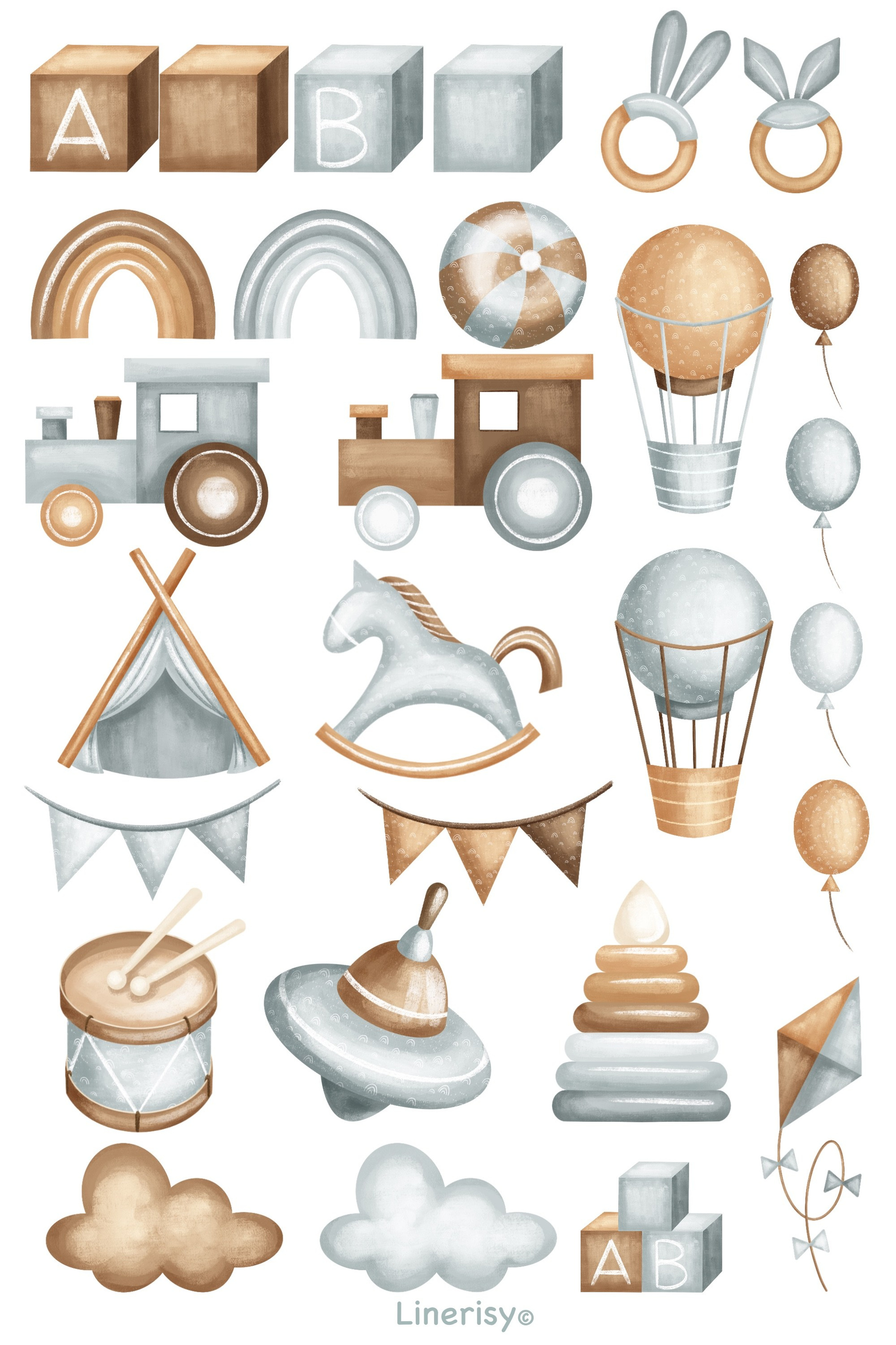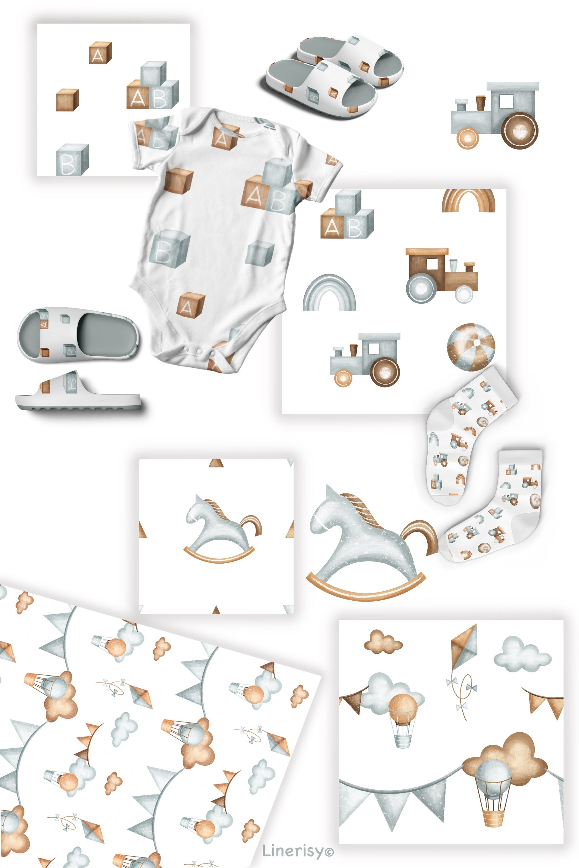 Яркая детская коллекция бесшовных паттернов, графических элементов, постеров и иллюстраций. В коллекции много разнообразных нарисованных игрушек для малыша — пирамидка, юла, лошадка, воздушные шары, паровозики, мячик, кубики, облачка и другие игрушки для новорожденных. Иллюстрации нарисованы в ручную текстурными кистями в пастельной гамме. В коллекции также представлены рамки для фотографий и открыток, и карточки для новорожденных. Коллекция идеально подходит для детских дизайнов, текстиля, одежды и других товаров для малышей.