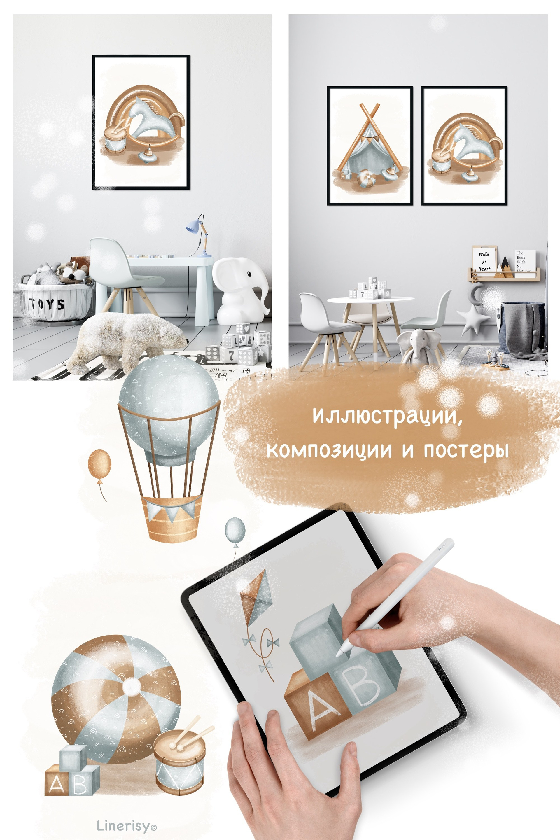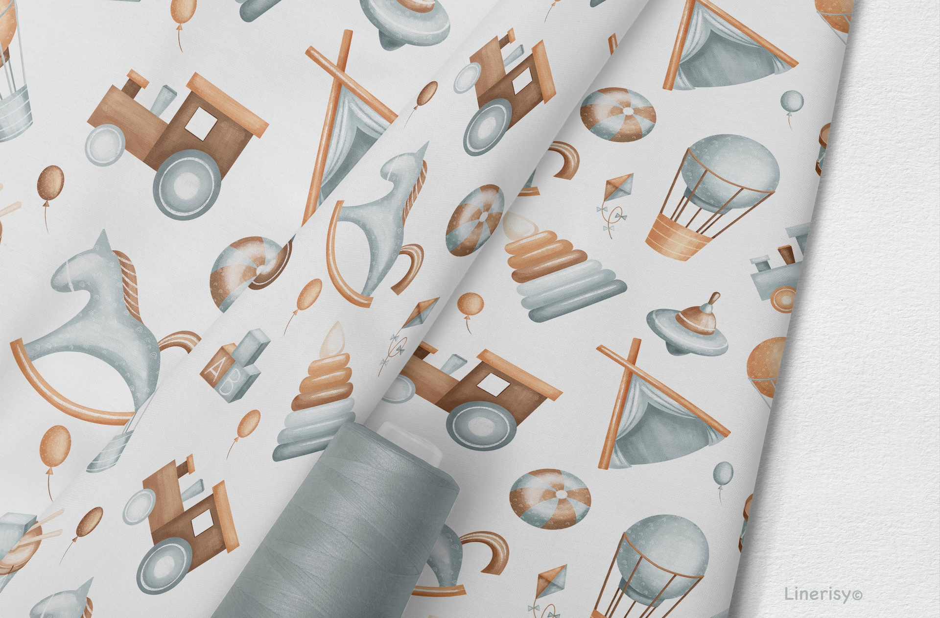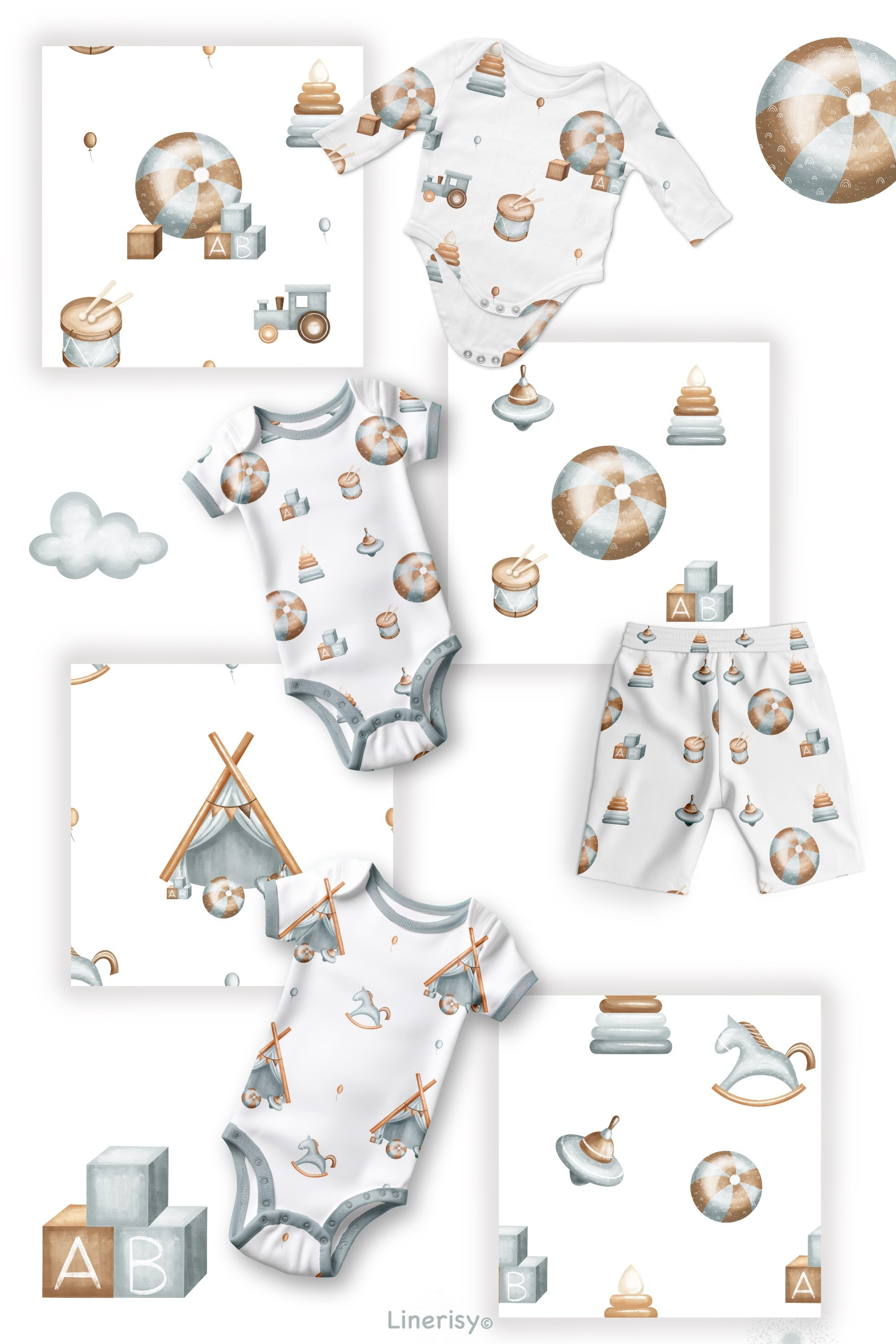 Яркая детская коллекция бесшовных паттернов, графических элементов, постеров и иллюстраций. В коллекции много разнообразных нарисованных игрушек для малыша — пирамидка, юла, лошадка, воздушные шары, паровозики, мячик, кубики, облачка и другие игрушки для новорожденных. Иллюстрации нарисованы в ручную текстурными кистями в пастельной гамме. В коллекции также представлены рамки для фотографий и открыток, и карточки для новорожденных. Коллекция идеально подходит для детских дизайнов, текстиля, одежды и других товаров для малышей.