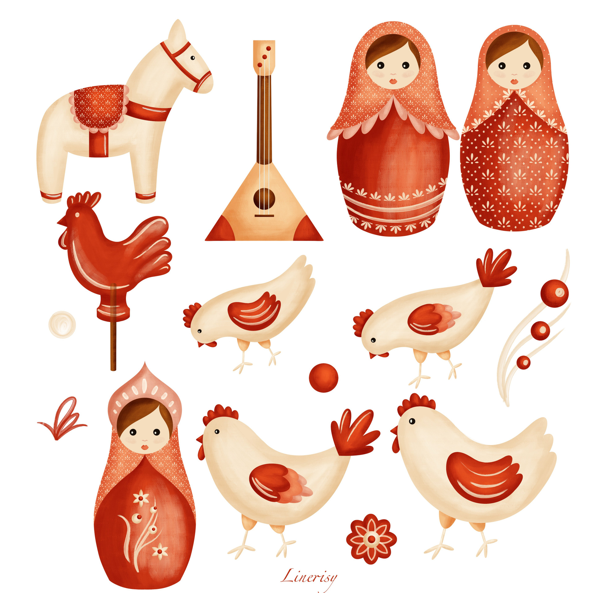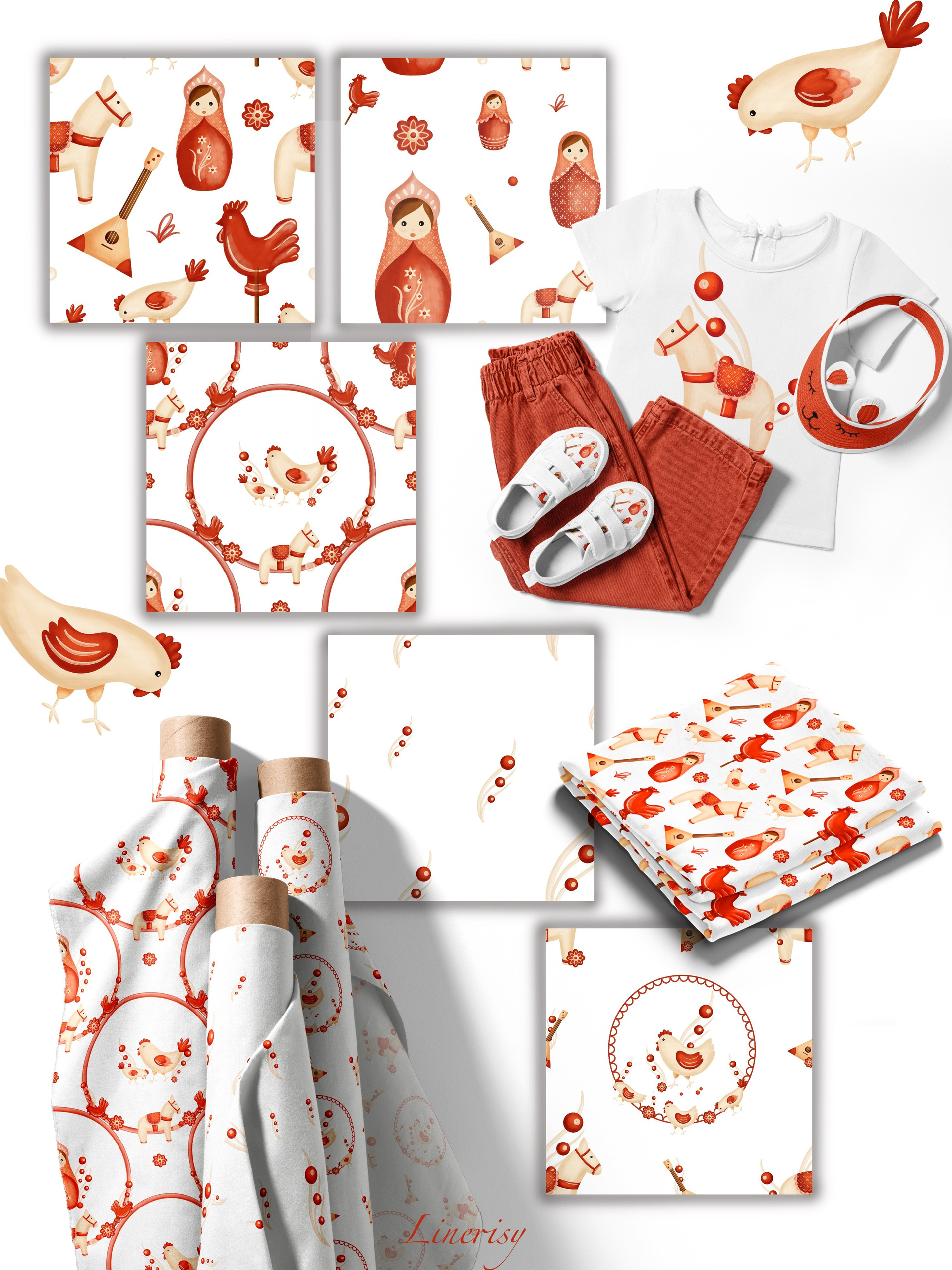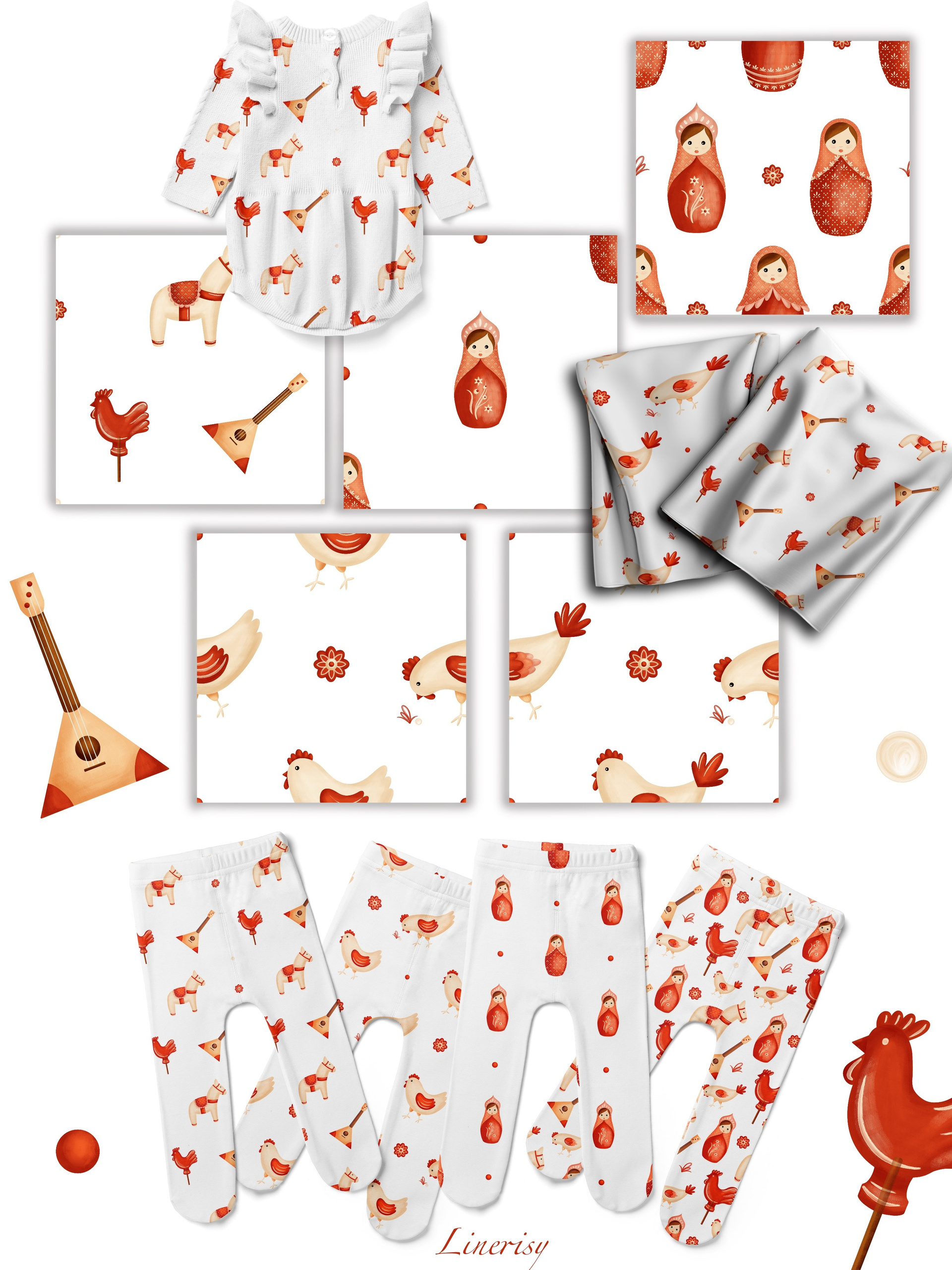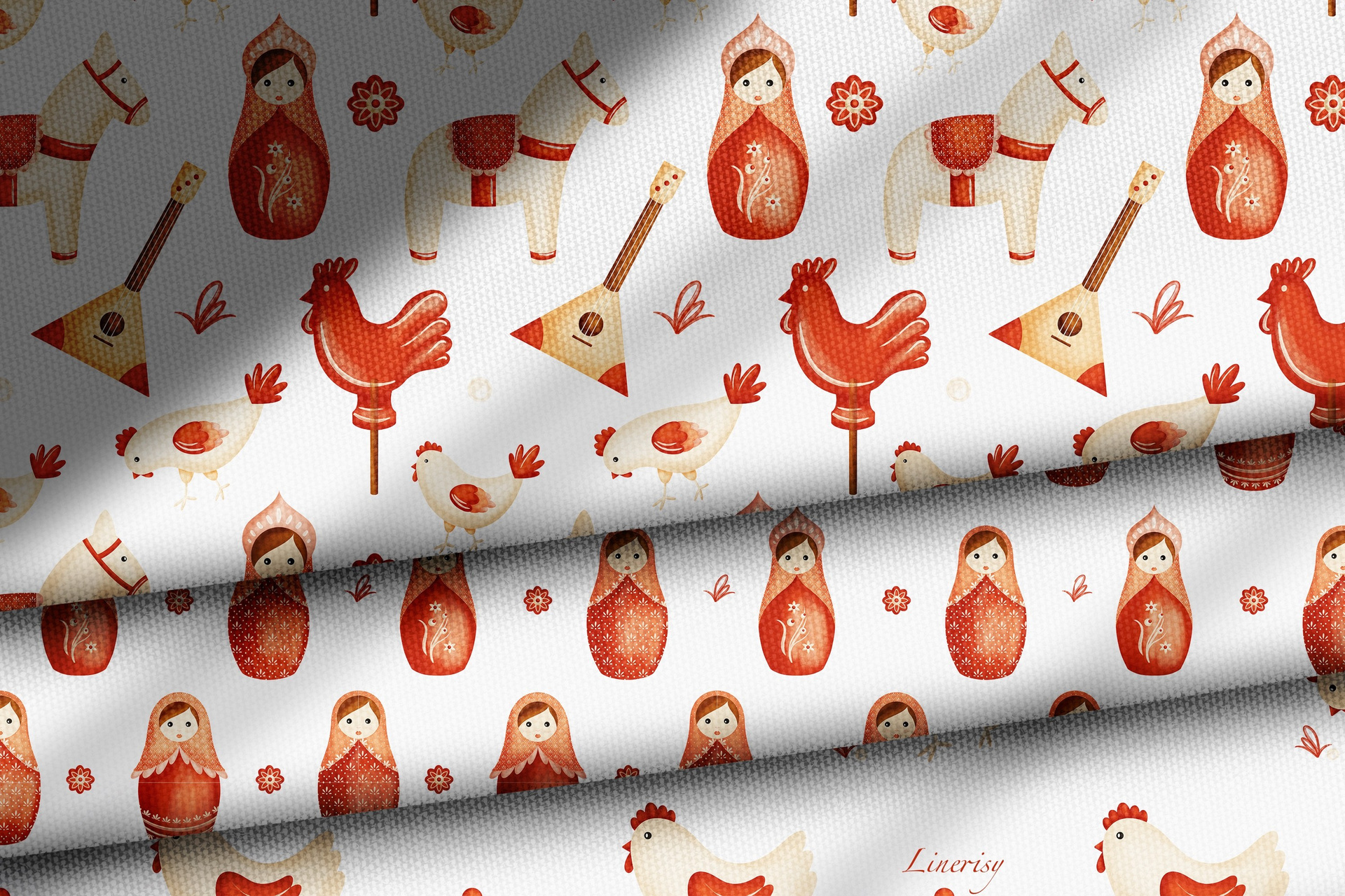 Яркая коллекция «Матрешки» с традиционными элементами, отражающими русскую культуру. Коллекция с милыми национальными иллюстрациями матрешек, лошадки, балалайки, петушка и мылых курочек. Уникальная коллекция, которую можно использовать для детской продукции, текстиля, канцелярии и других уникальных товаров.