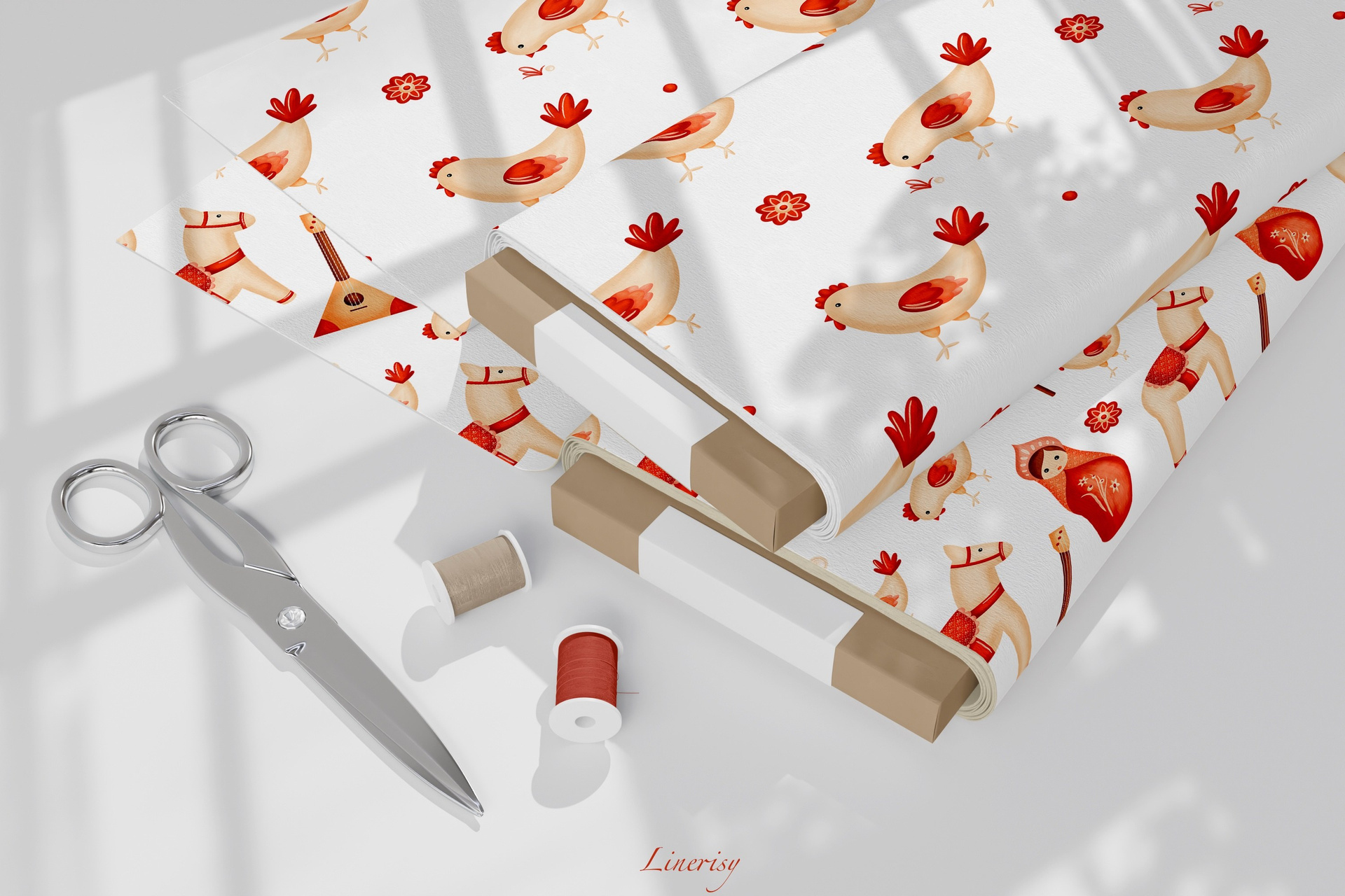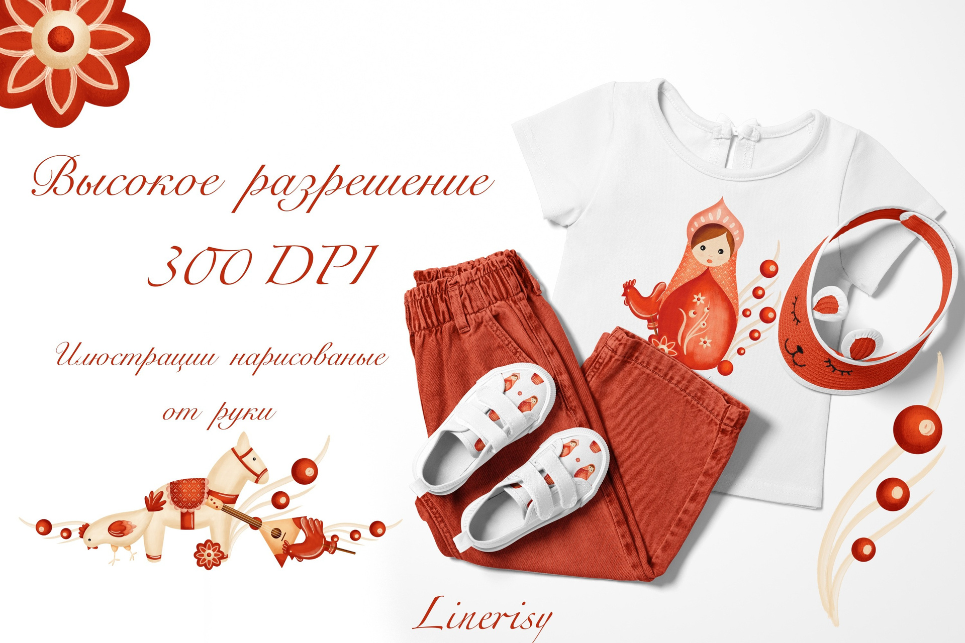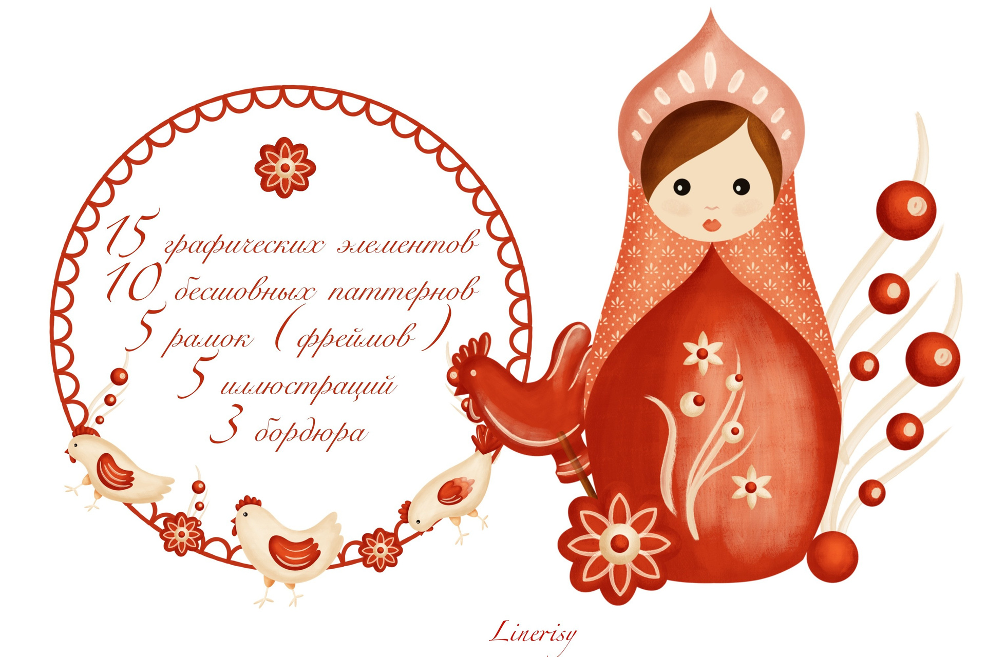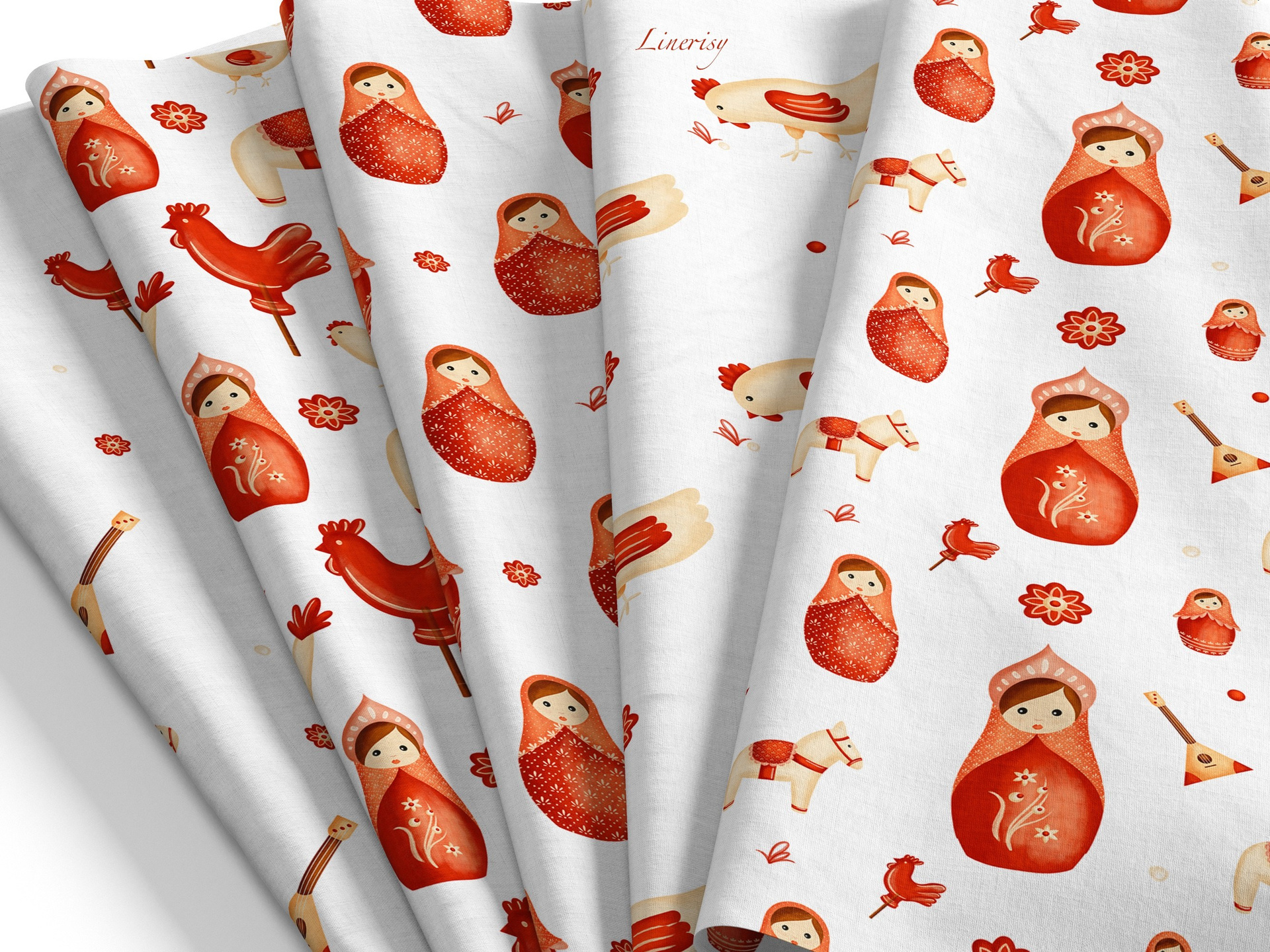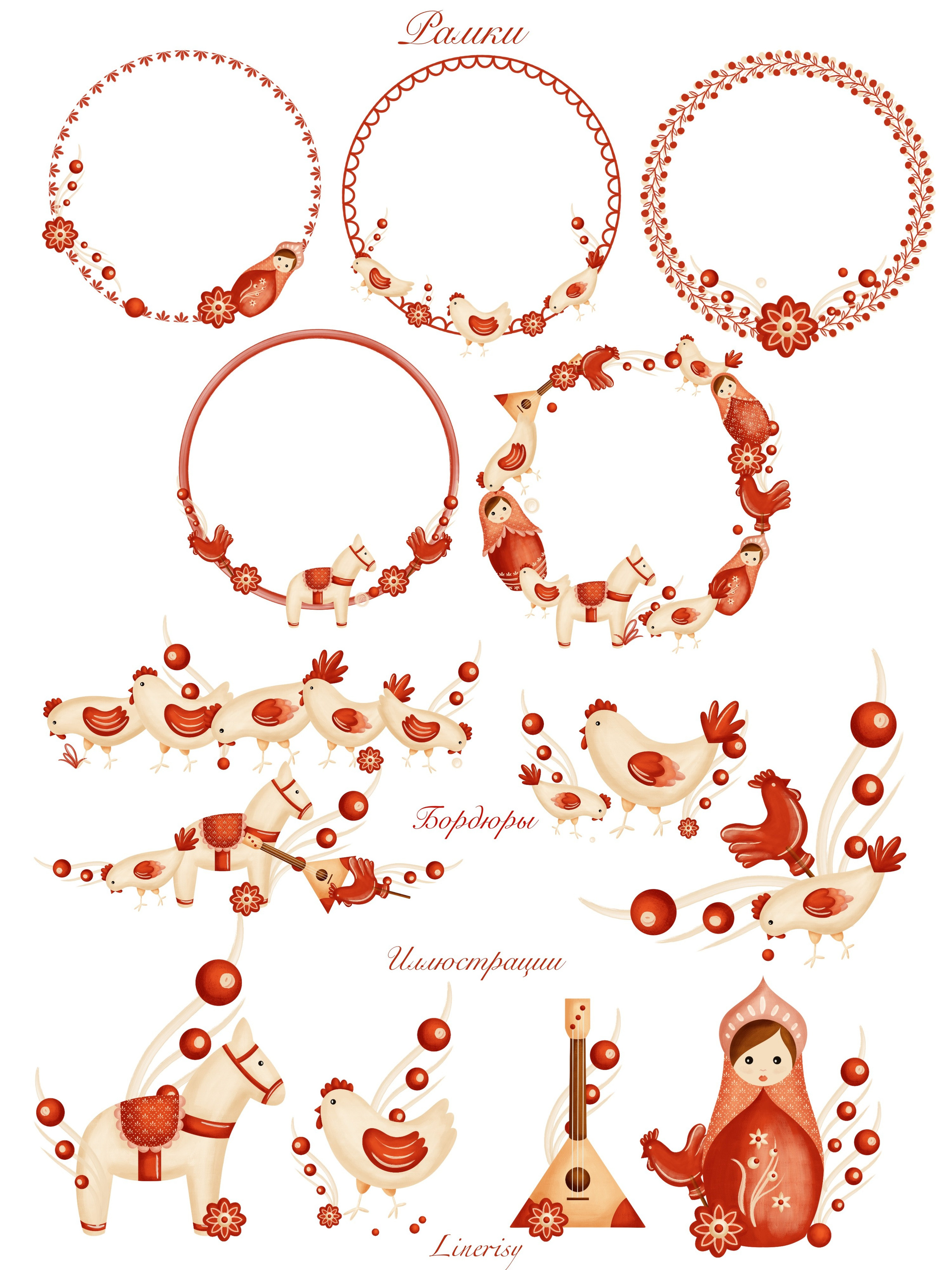 Яркая коллекция «Матрешки» с традиционными элементами, отражающими русскую культуру. Коллекция с милыми национальными иллюстрациями матрешек, лошадки, балалайки, петушка и мылых курочек. Уникальная коллекция, которую можно использовать для детской продукции, текстиля, канцелярии и других уникальных товаров.