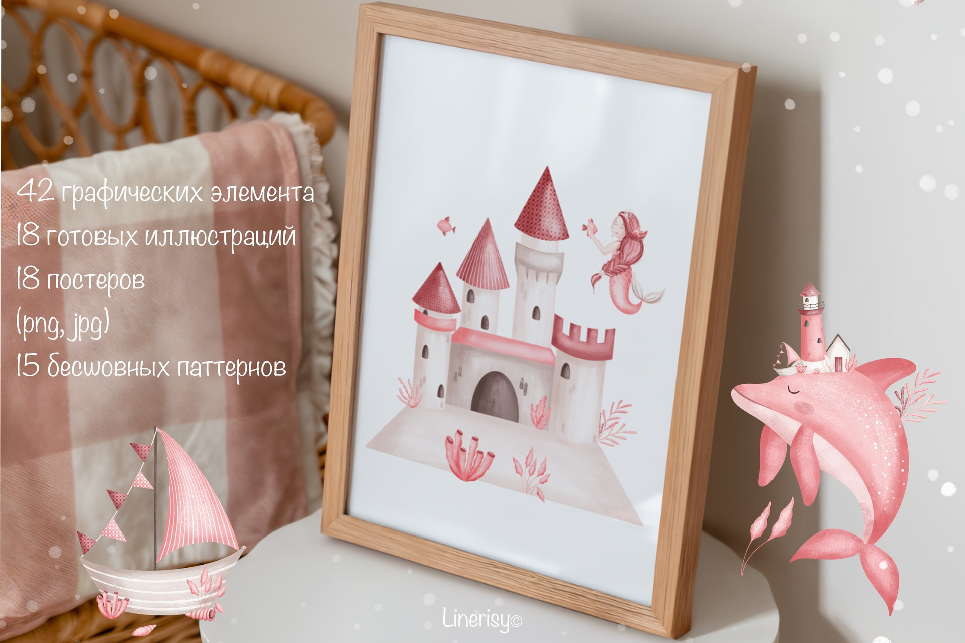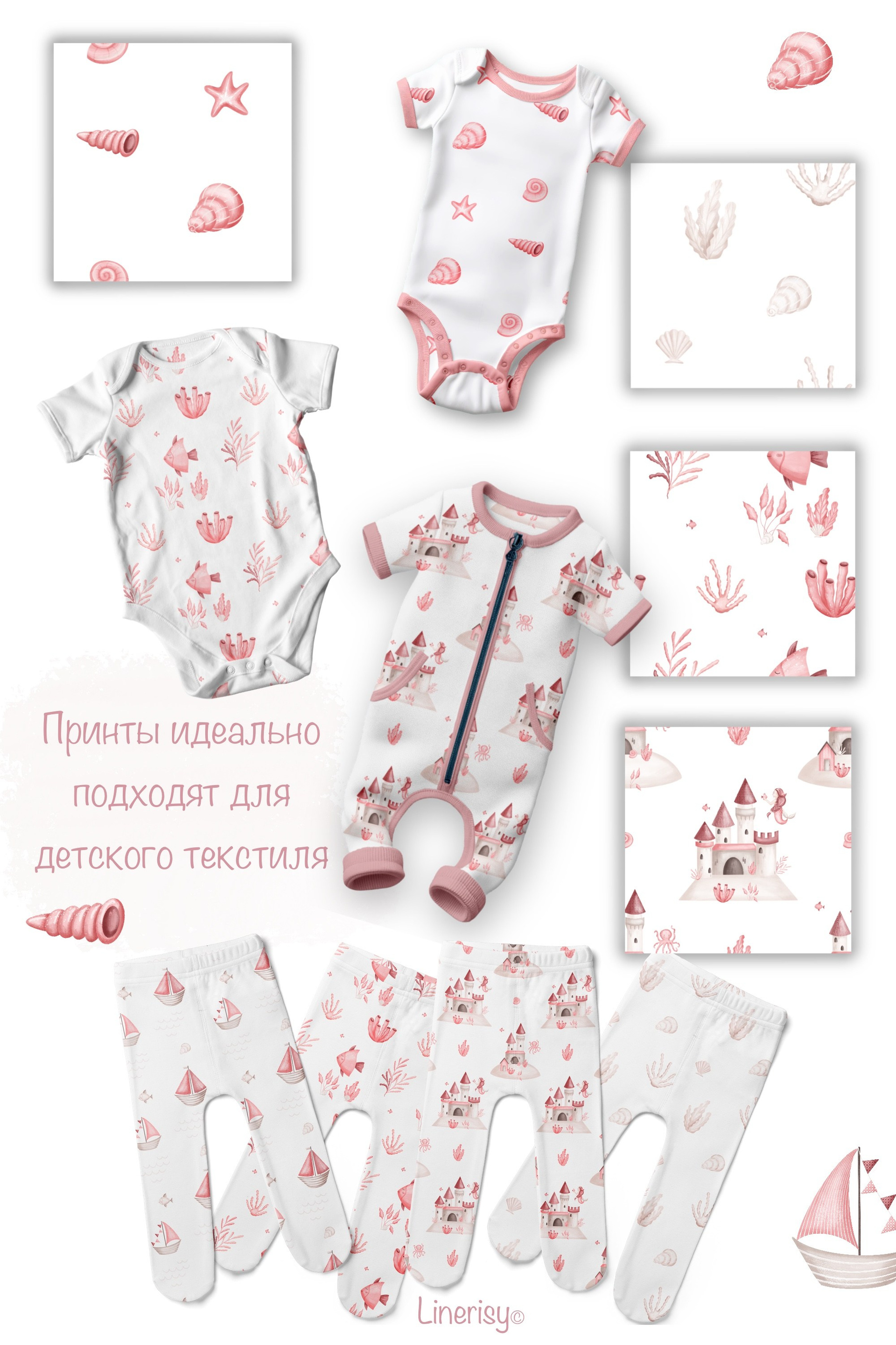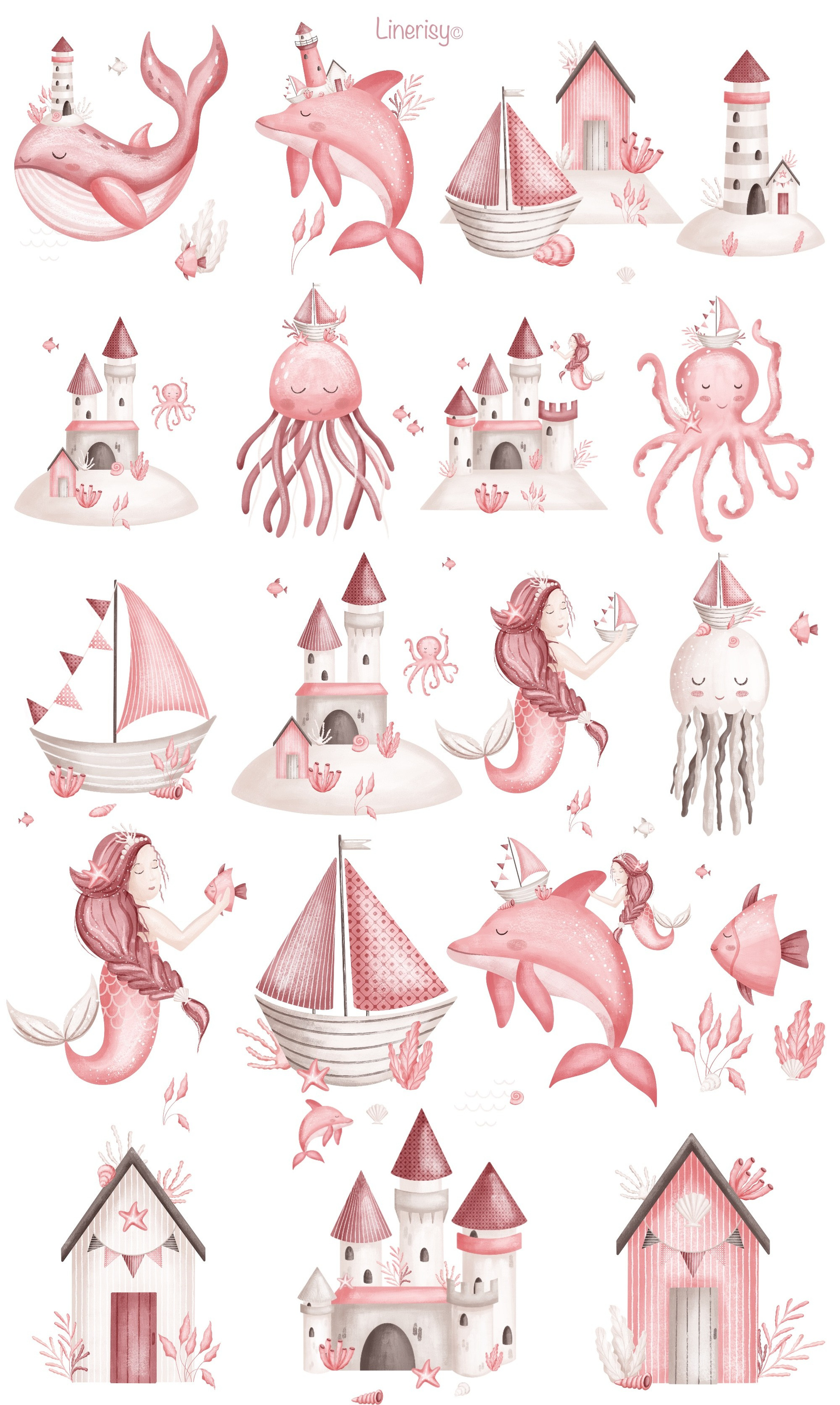 Нежный набор для ваших маленьких принцесс. В коллекции много элементов морских жителей, русалка, корабликов, маяков, разнообразных ракушек и водорослей. Иллюстрации нарисованы в ручную текстурными кистями в пастельной нежной розовой гамме. В коллекции представлены графические элементы, иллюстрации, постеры и бесшовные паттерны. Коллекция идеально подходит для детских дизайнов, текстиля, одежды и других товаров для малышей