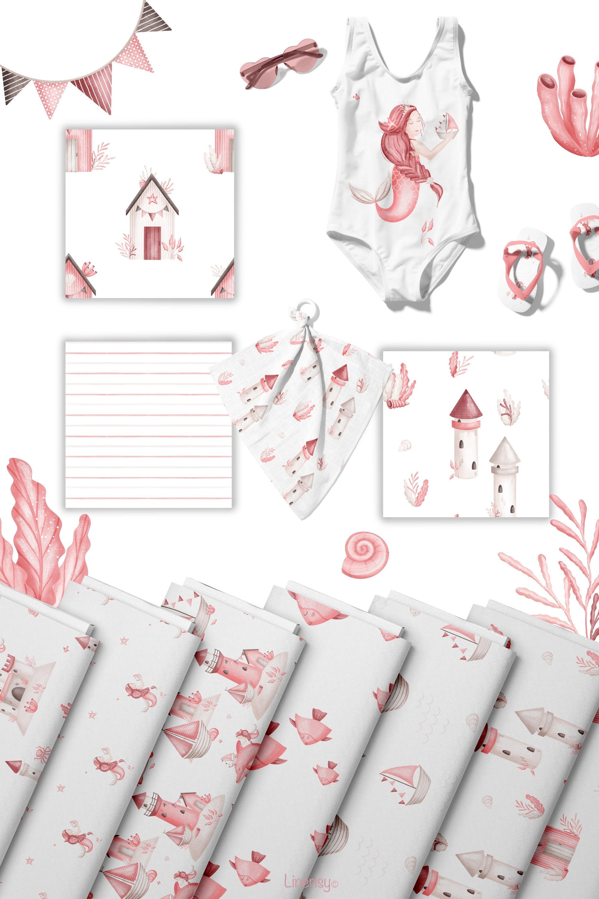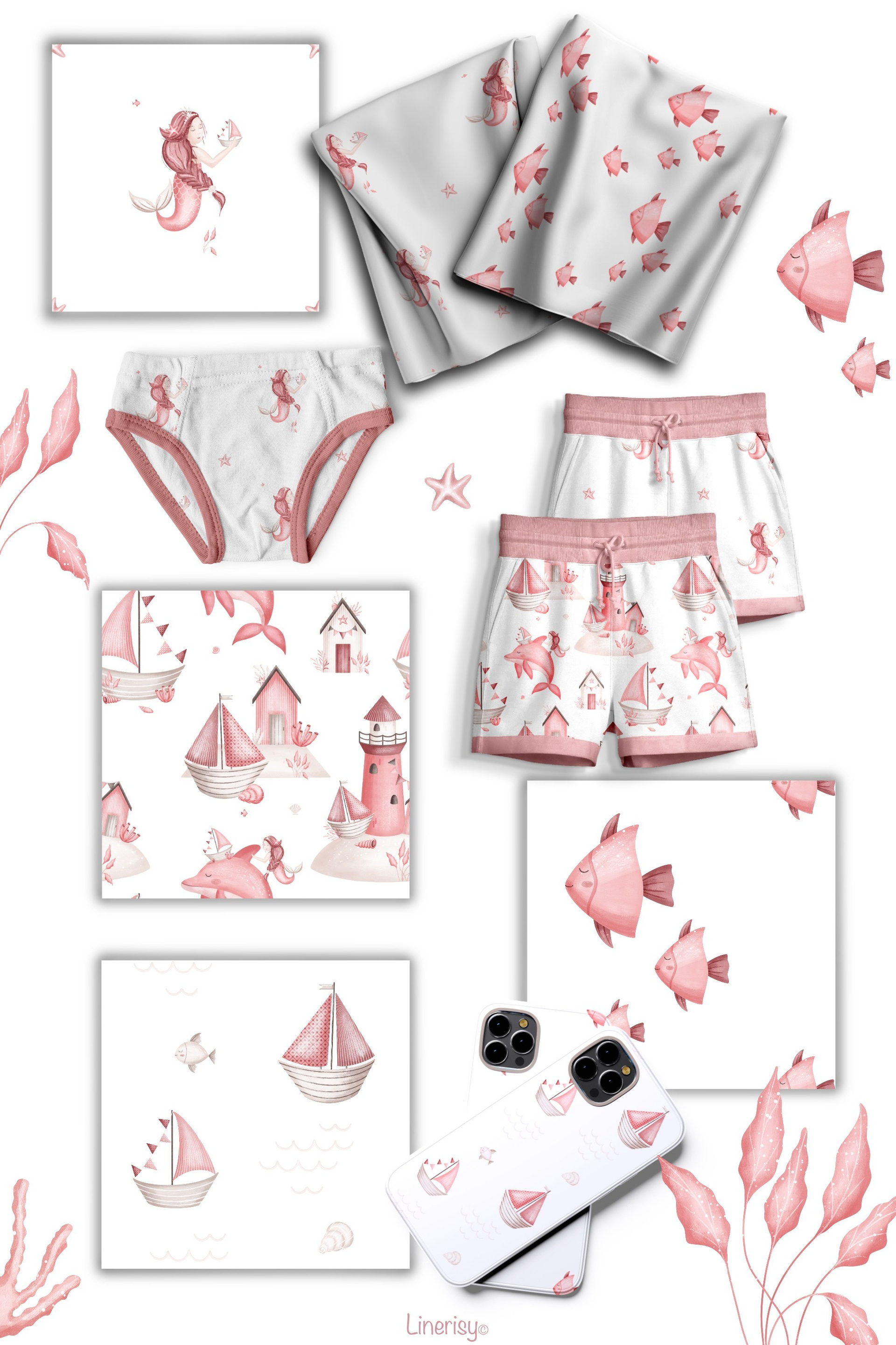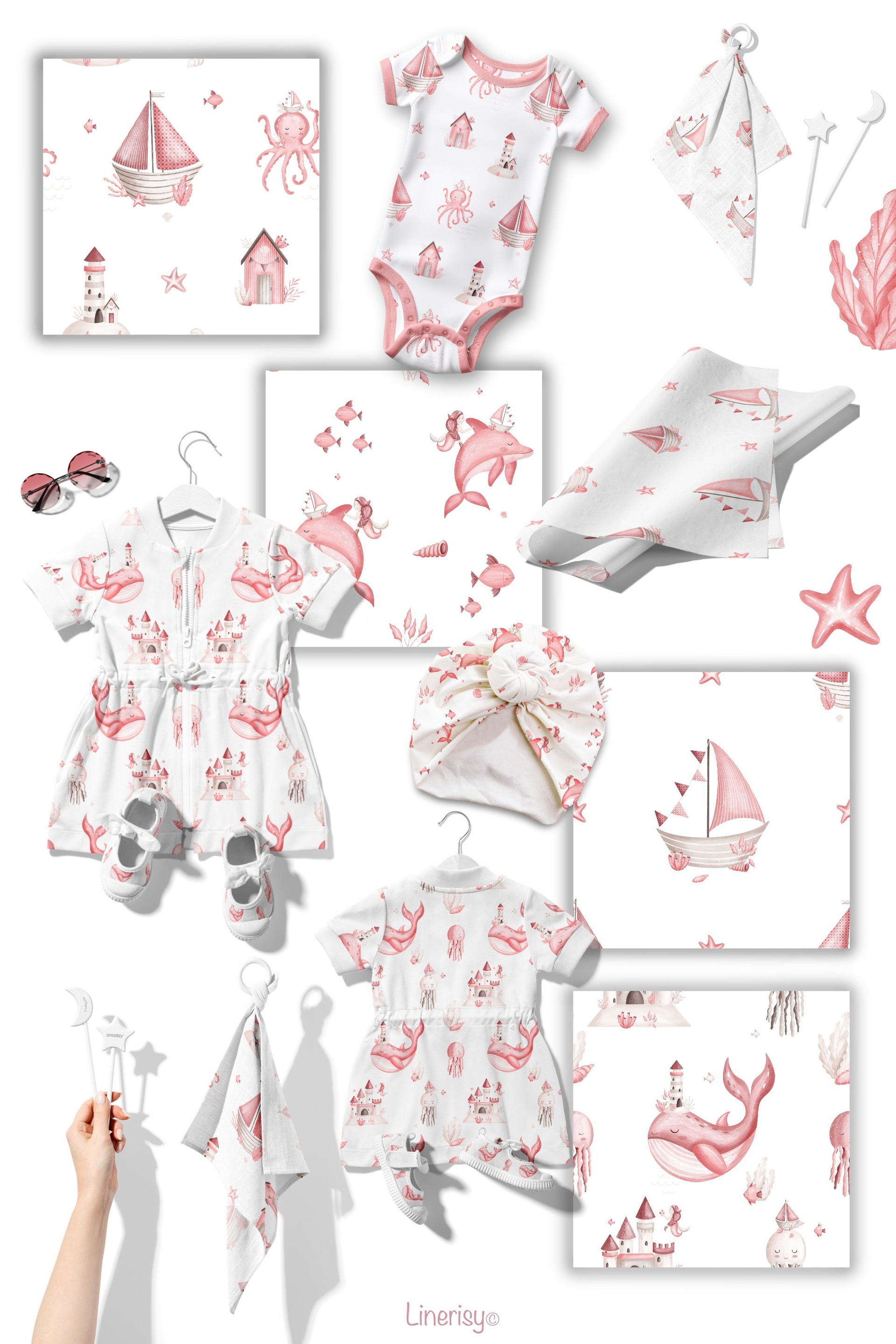 Нежный набор для ваших маленьких принцесс. В коллекции много элементов морских жителей, русалка, корабликов, маяков, разнообразных ракушек и водорослей. Иллюстрации нарисованы в ручную текстурными кистями в пастельной нежной розовой гамме. В коллекции представлены графические элементы, иллюстрации, постеры и бесшовные паттерны. Коллекция идеально подходит для детских дизайнов, текстиля, одежды и других товаров для малышей