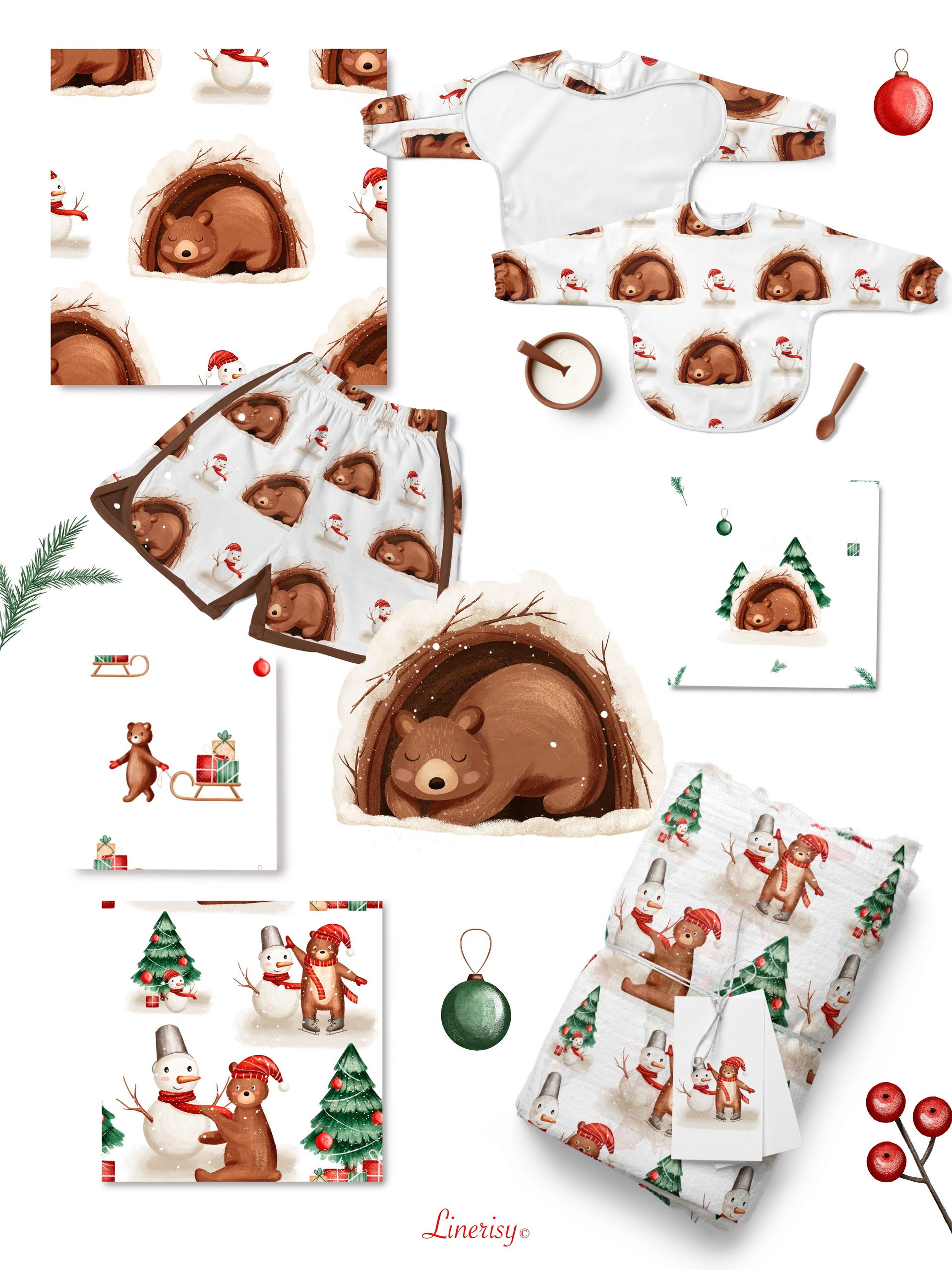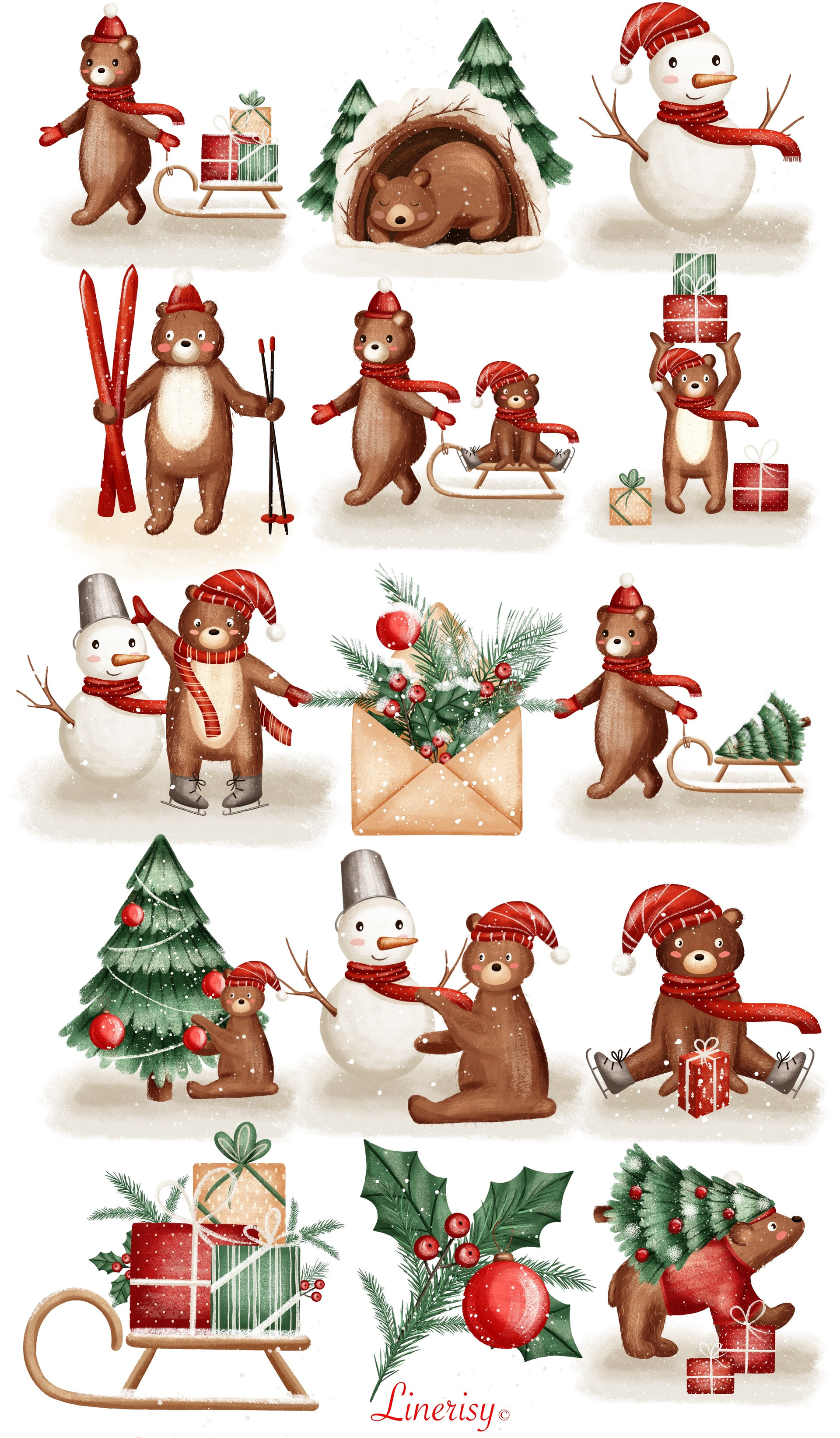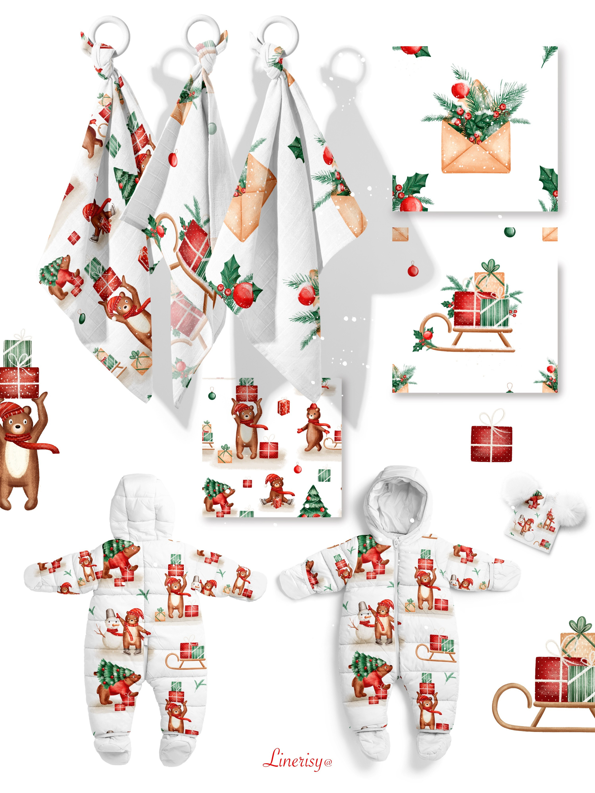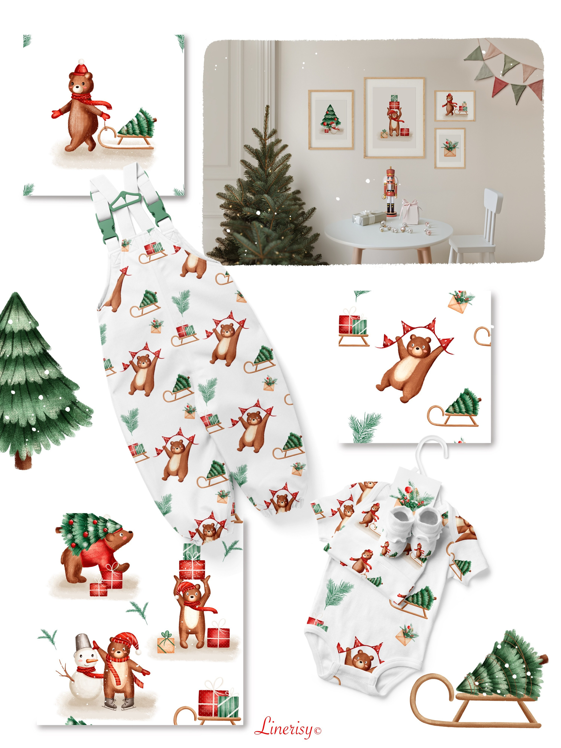 Яркая новогодняя коллекция бесшовных паттернов, графических элементов, постеров и иллюстраций. В коллекции представлен набор новогодних медведей с различными зимними и новогодними аксессуарами- елочкой, санками, новогодними игрушками, подарками, еловыми ветками и т. д. Коллекция идеально подходит для детских новогодних дизайнов