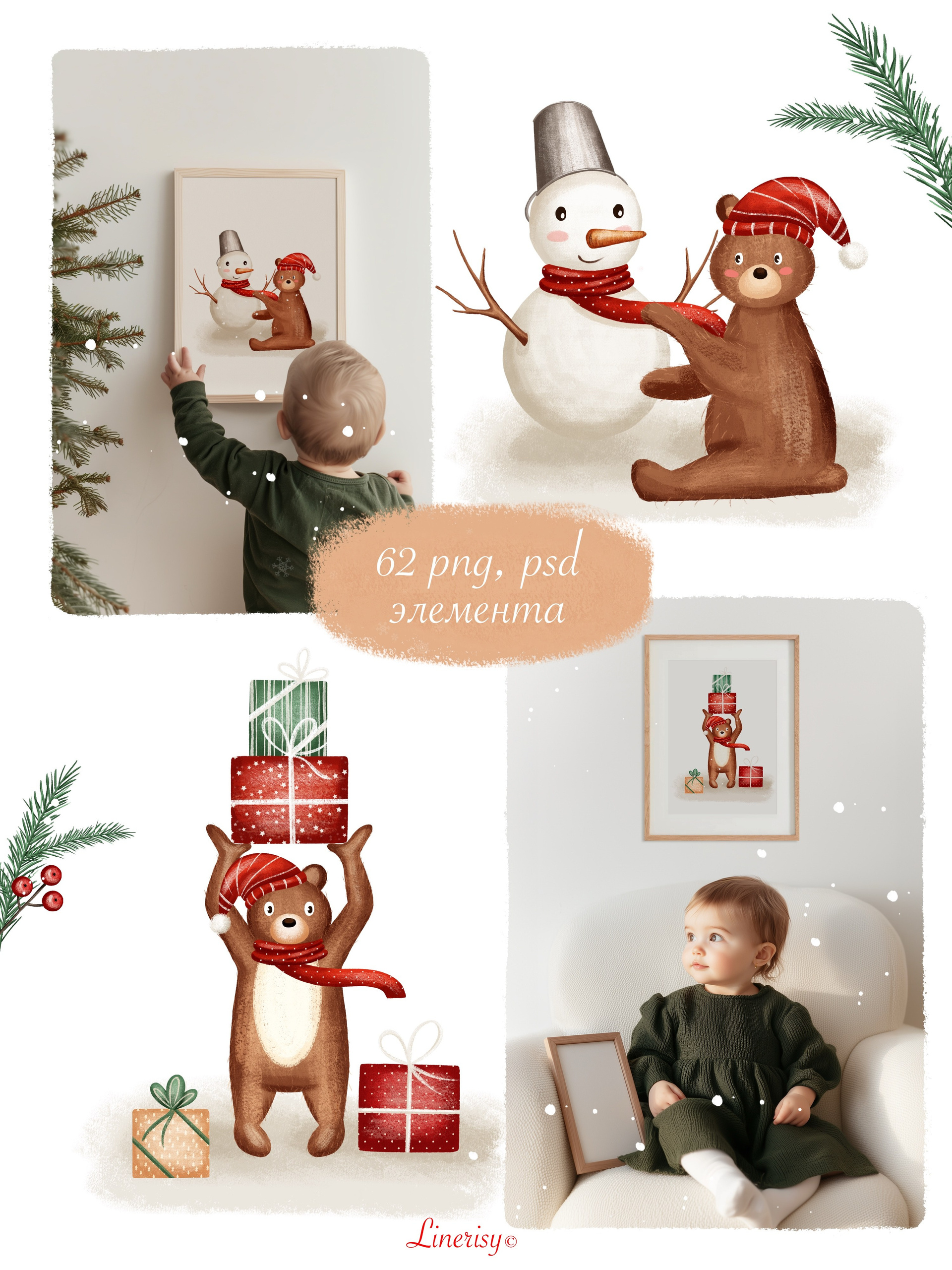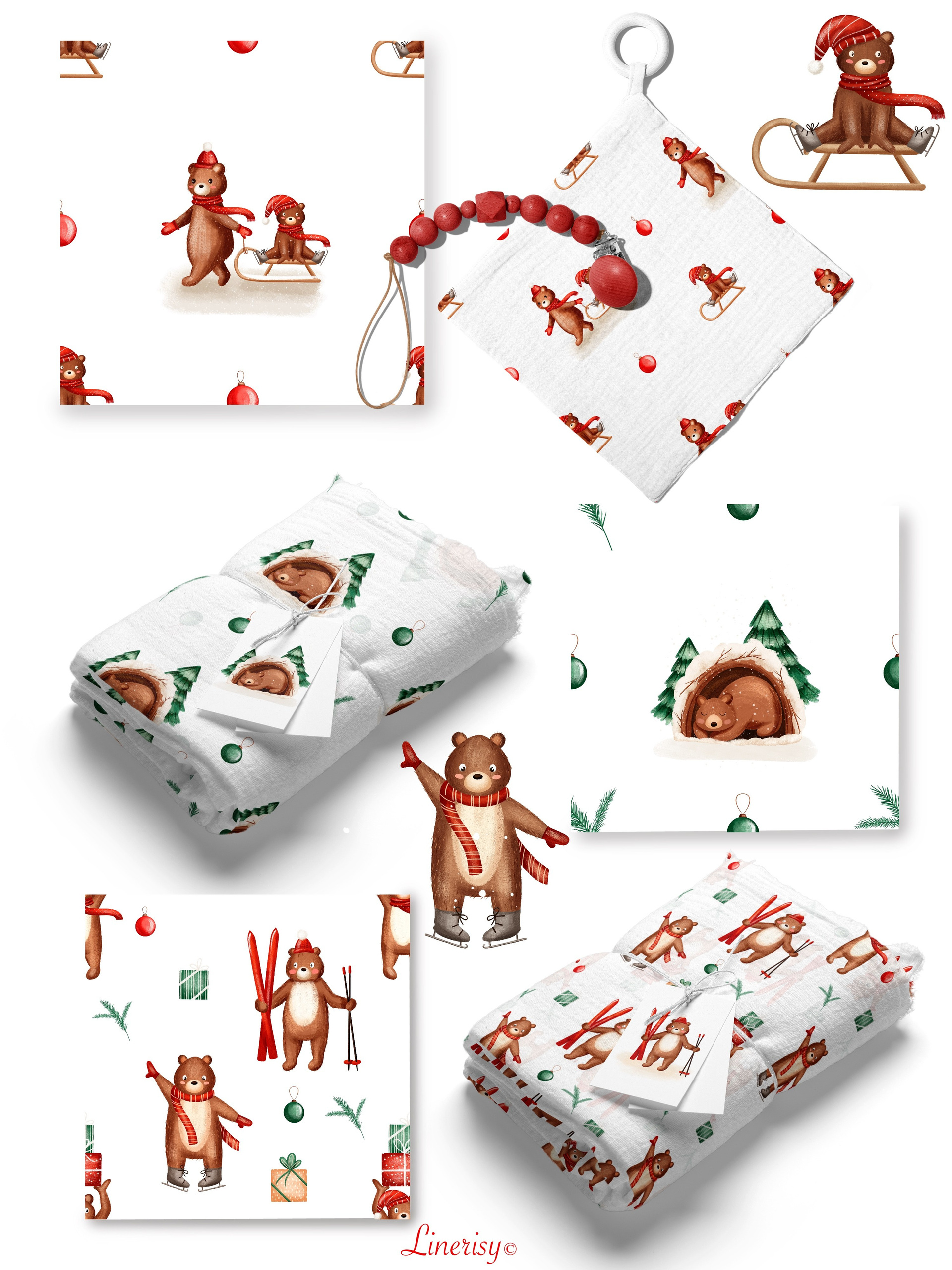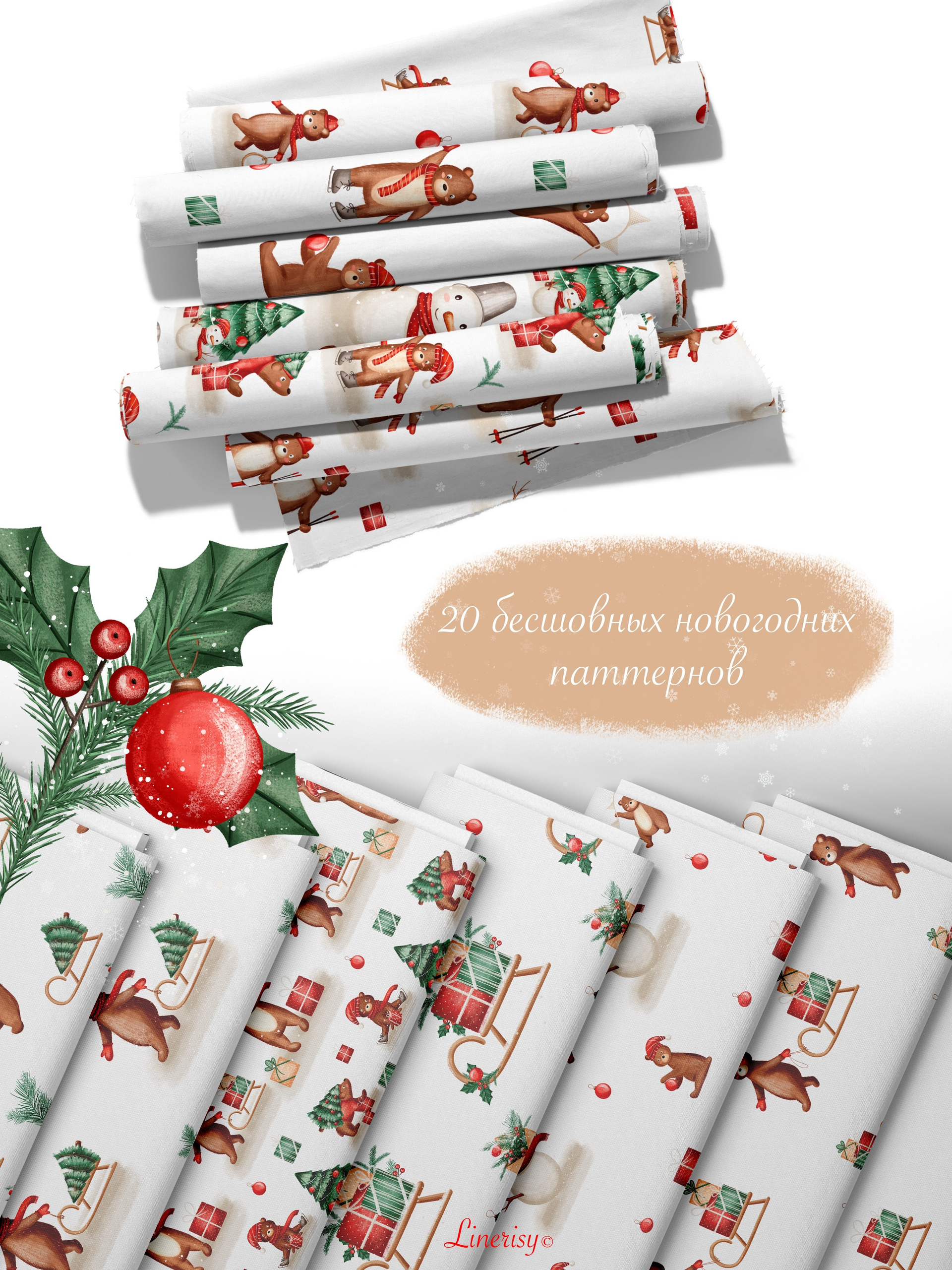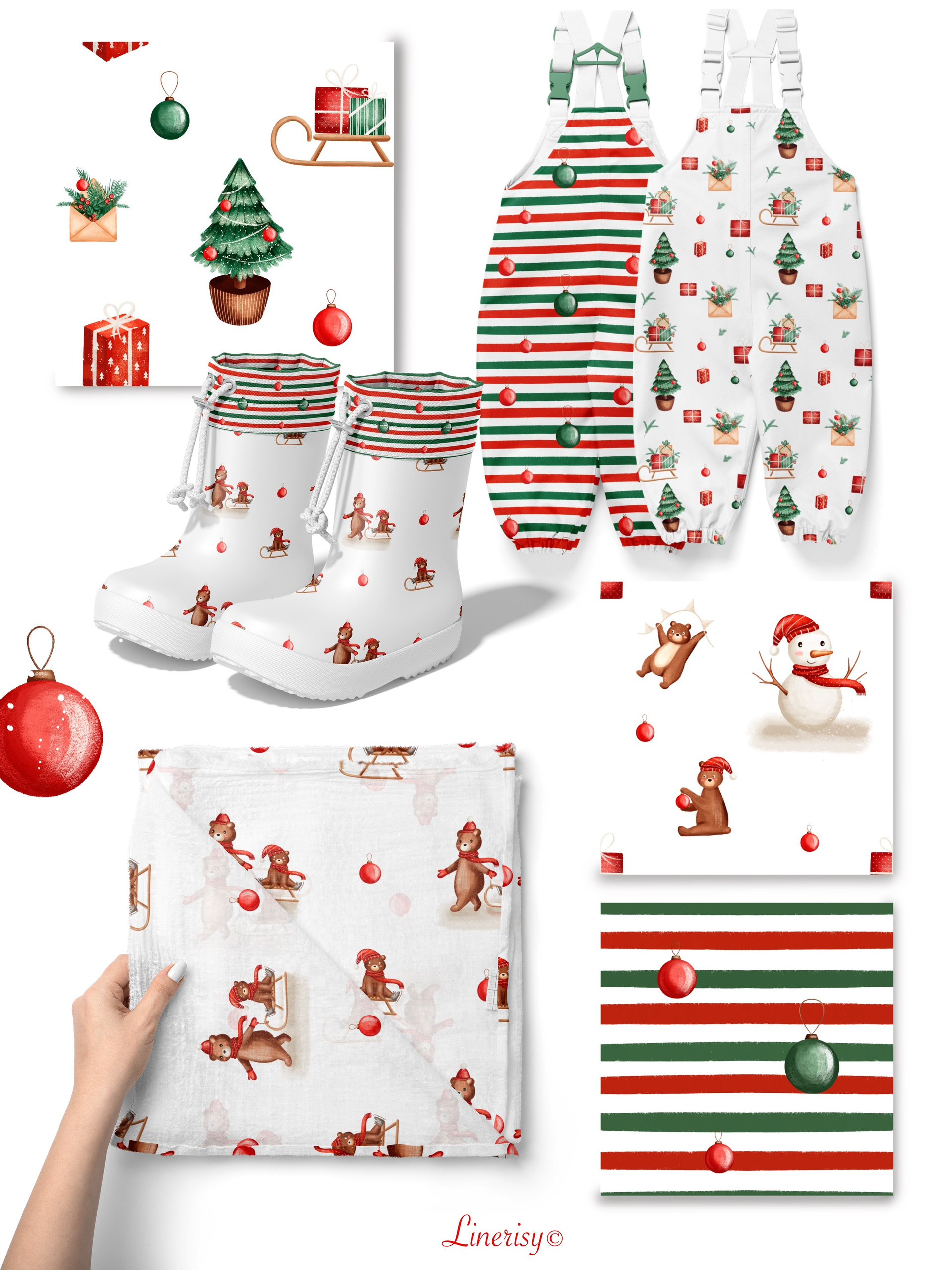 Яркая новогодняя коллекция бесшовных паттернов, графических элементов, постеров и иллюстраций. В коллекции представлен набор новогодних медведей с различными зимними и новогодними аксессуарами- елочкой, санками, новогодними игрушками, подарками, еловыми ветками и т. д. Коллекция идеально подходит для детских новогодних дизайнов