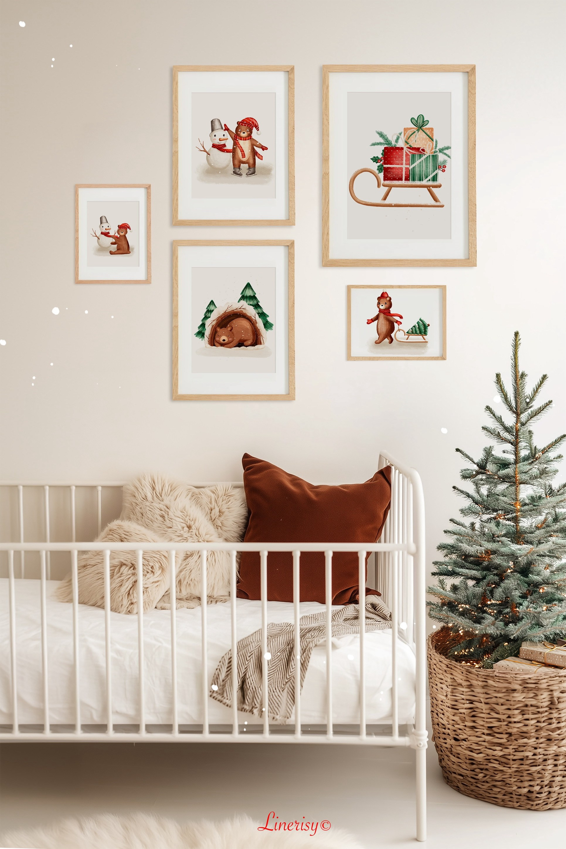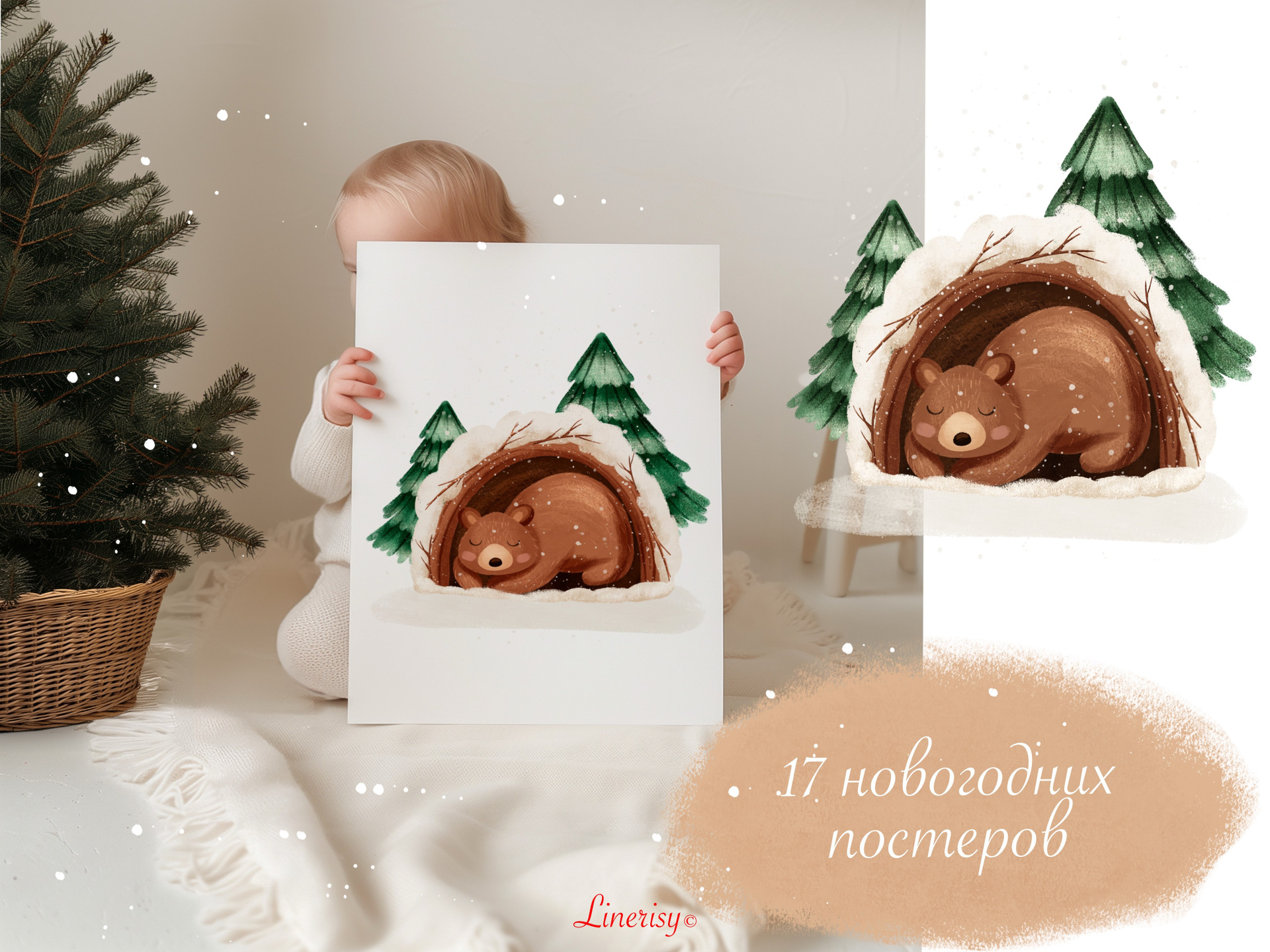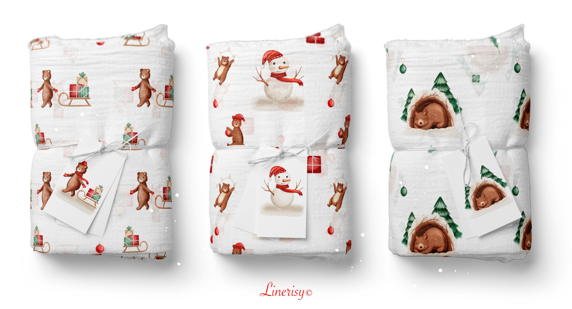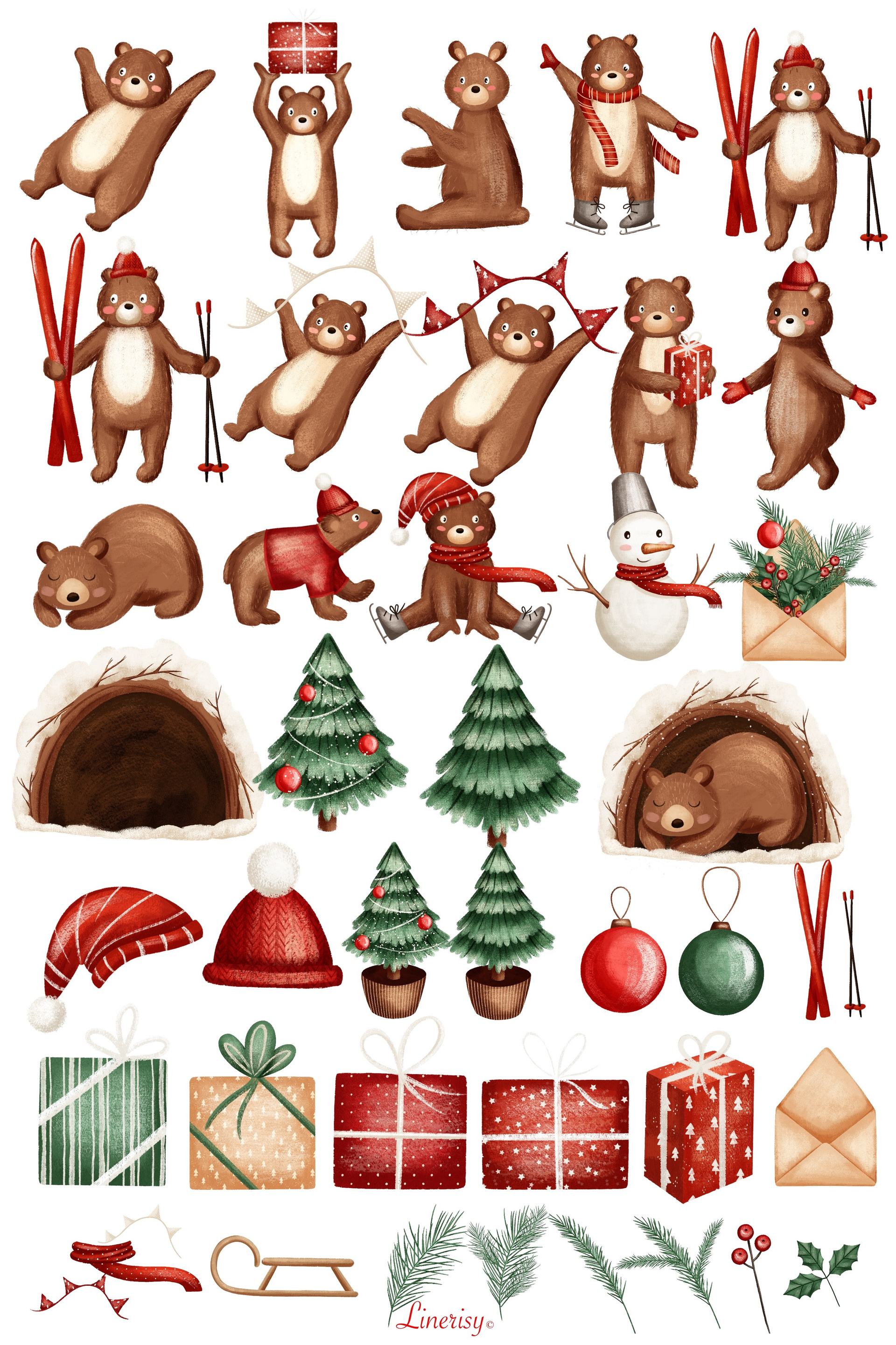 Яркая новогодняя коллекция бесшовных паттернов, графических элементов, постеров и иллюстраций. В коллекции представлен набор новогодних медведей с различными зимними и новогодними аксессуарами- елочкой, санками, новогодними игрушками, подарками, еловыми ветками и т. д. Коллекция идеально подходит для детских новогодних дизайнов