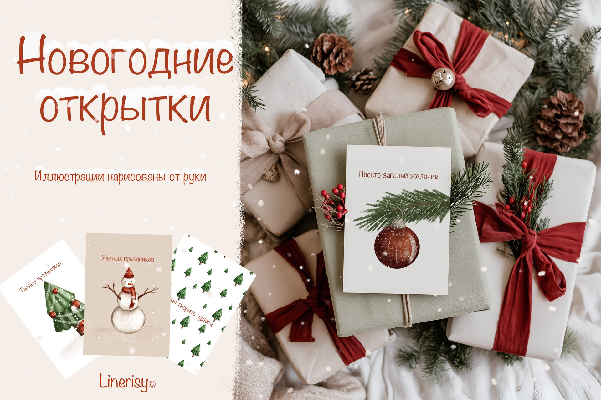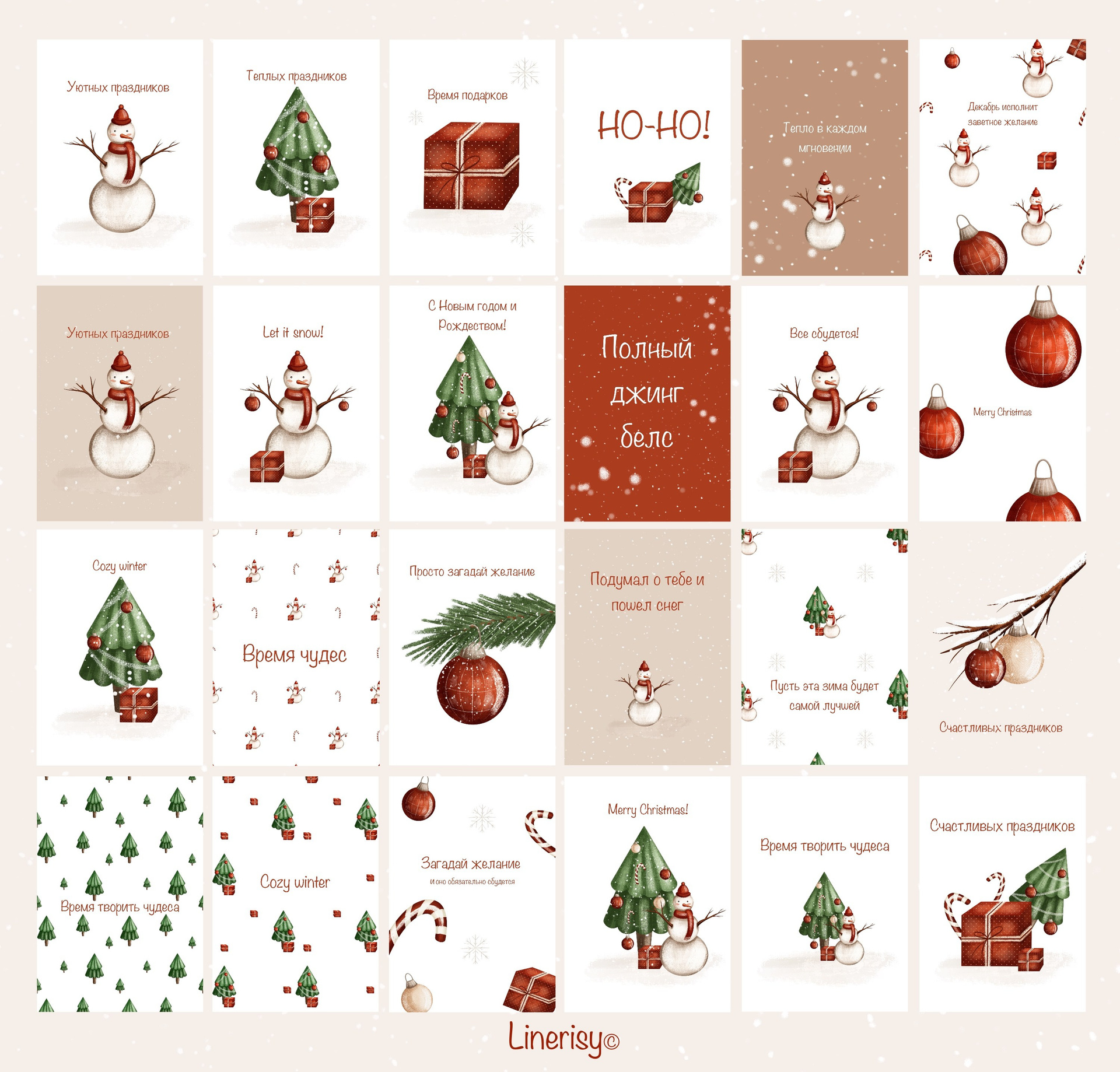 Волшебный зимний новогодний набор открыток с ёлочками, снежинками, подарками, снеговиком, ёлочными игрушками. В наборе 24 готовых открыток А5 с текстом на русском и английском языках, 7 бесшовных паттернов и 10 графических элементов для ваших дизайнов.